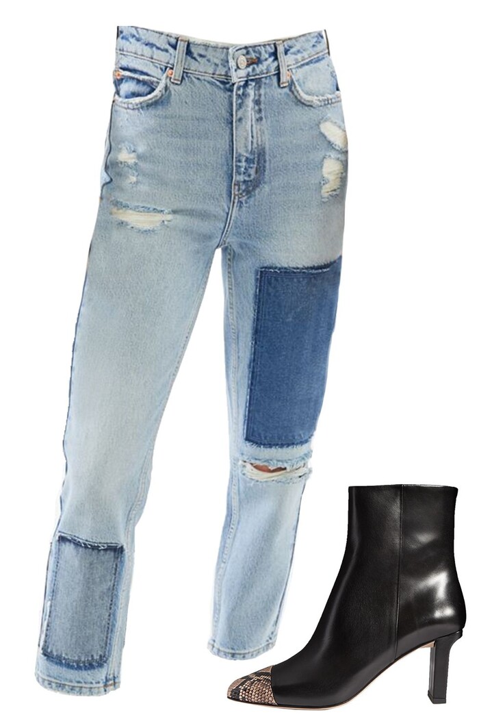 Quần jean chắp vá không dễ mặc nhưng vẫn là một item nên có trong tủ quần áo của các nàng. Để làm cho chúng trông bóng bẩy hơn một chút, bạn hãy thử kết hợp với một đôi giày da bóng (không dùng chất da lộn) để trở về dòng chảy năm 70s.