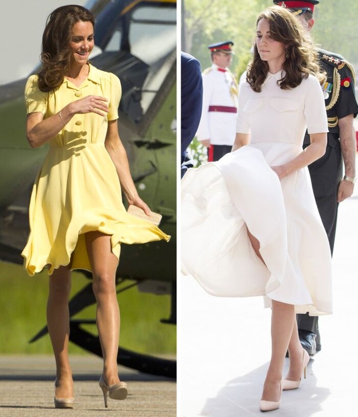 Khi mới về làm dâu, một số kiểu váy cao trên gối của cô không được sự ưng thuận từ Nữ hoàng. Sau đó, Kate cùng stylist đã chuyển sang váy cao quá gối để tránh các sự cố đáng tiếc. Những người chuẩn bị trang phục cho Hoàng gia còn chế tạo ra các quả nặng nhỏ gắn ở chân váy để chắn gió cho Công nương.