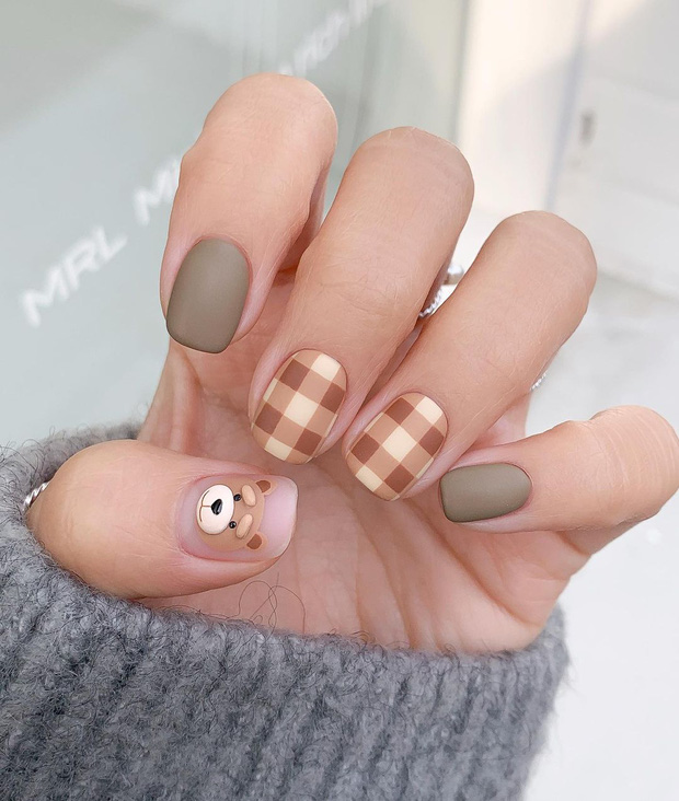 Nhiều người sẽ chuộng kiểu sơn móng lì nên mẫu nail màu xanh rêu/nâu bên dưới sẽ là gợi ý không tồi đâu.