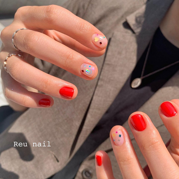 Thích bộ nail đơn giản mà vẫn đảm bảo ấn tượng, hút mắt, vậy bạn nên tia gấp style vẽ móng sau đây. Sắc đỏ rực sang chảnh đan xen màu kim tuyến óng ánh sẽ giúp sang tay và khiến tổng thể xịn xò thực sự.