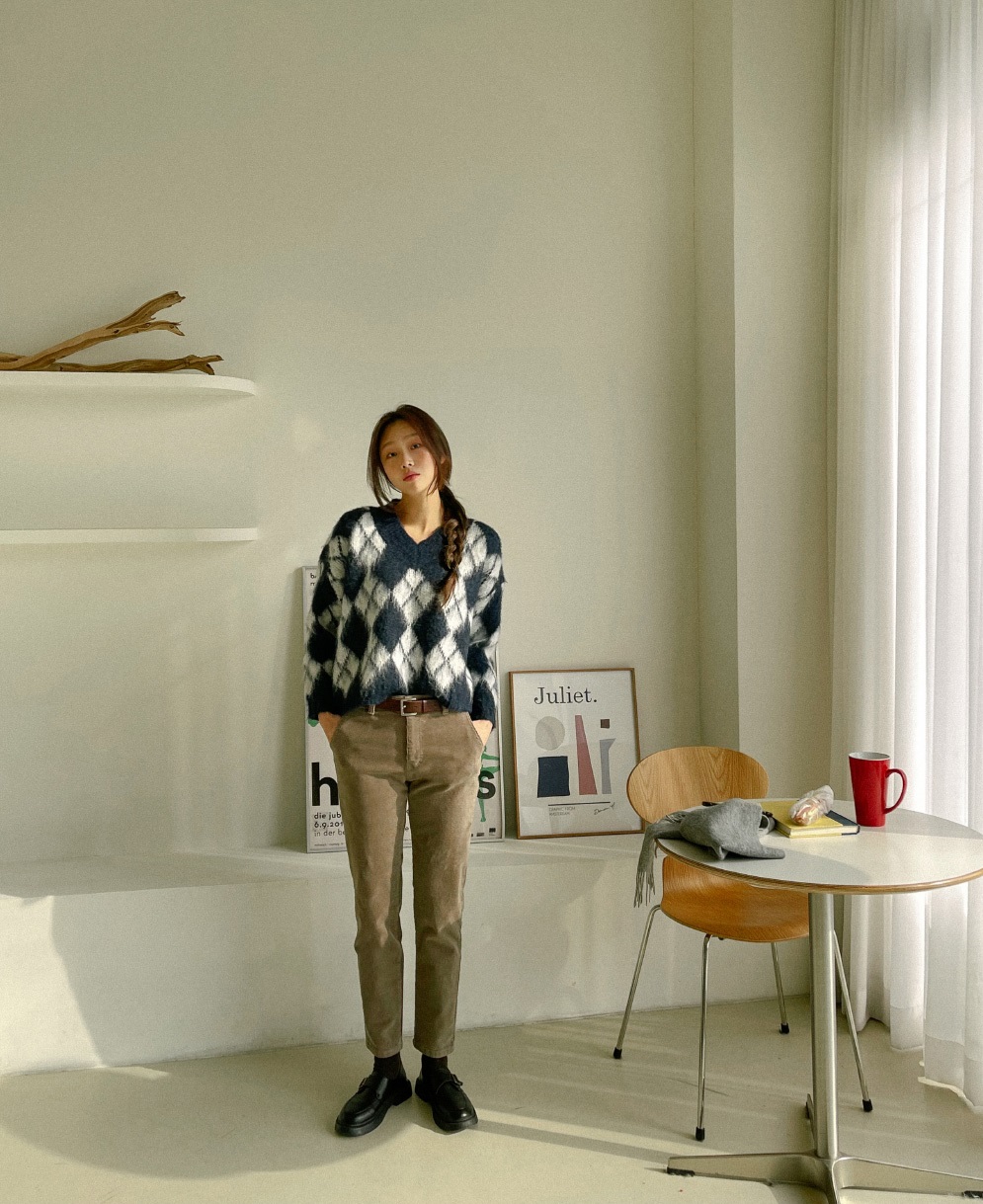 Vẫn mang gam màu trầm làm chủ đạo, tuy nhiên nếu áo len được phủ thêm họa tiết tươi sáng, nhã nhặn, bạn sẽ chẳng bao giờ lo bị "dừ" đi. Trái lại, áo len họa tiết trầm màu còn giúp bạn thêm nổi bật, trẻ trung và quan trọng, tổng thể vóc dáng cũng mi nhon, thon thả hẳn. Với kiểu áo bắt mắt này, bạn càng tinh giản những items đính kèm thì tổng thể trang phục càng hài hòa, đẹp mắt. Cụ thể là cứ mix áo len họa tiết tối màu với quần trơn màu trung tính và giày tối giản, bạn sẽ đạt 100 điểm sành điệu.