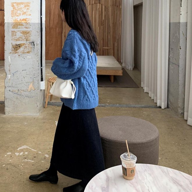 Outfit kiểu áo len dài dày sụ, thả ngoài chân váy midi hay quần tây ống rộng chỉ để ngắm thôi. Những chiếc áo dày, dài như thế này không phải là must-have item cho các cô nàng nấm lùn. Dù có sơ vin thì cũng khó mà giải quyết được những vết gồ lên kém tinh tế dưới chân váy hay quần lắm.