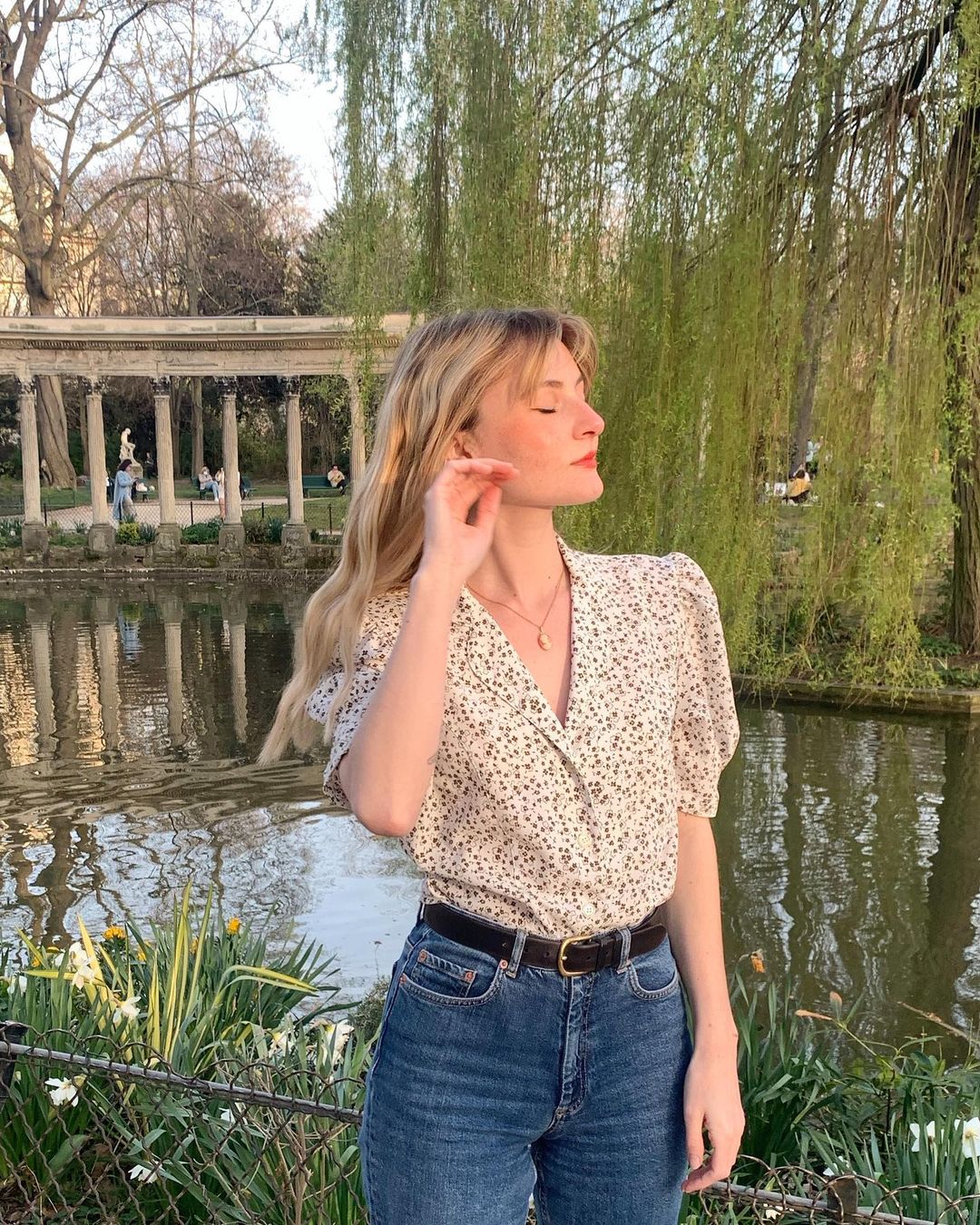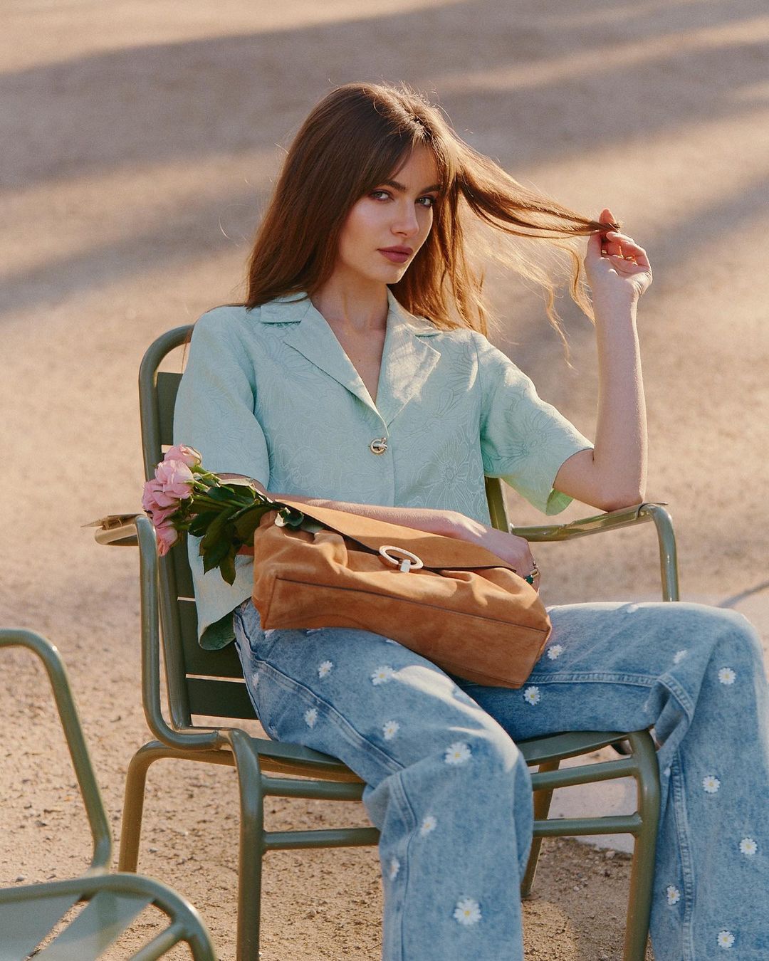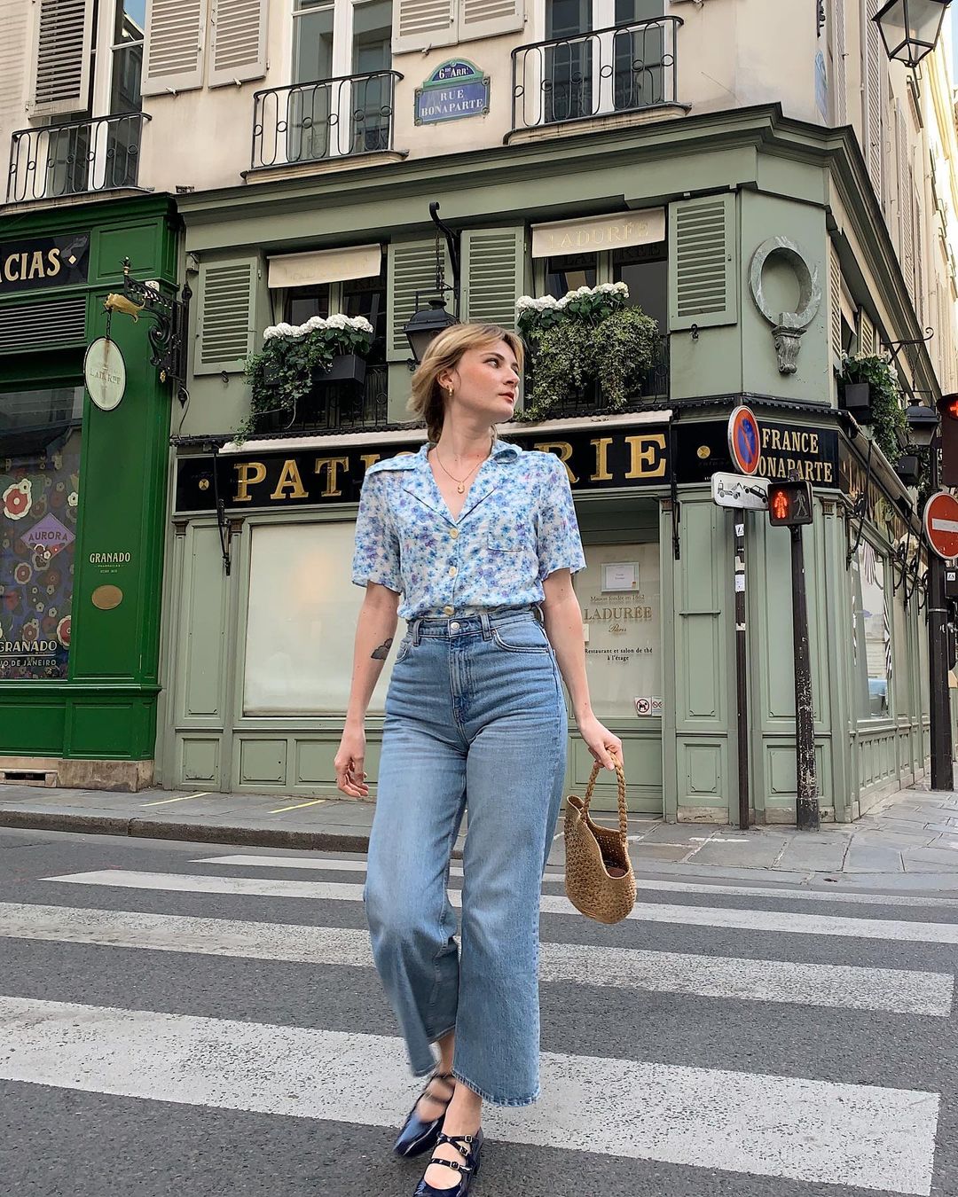 Áo sơ mi hoa cực kỳ hợp mix với quần jeans, đặc biệt là quần jeans xanh. Combo này hơi có nét vintage nên tăng thêm vẻ nổi bật, cuốn hút cho vẻ ngoài của bạn. Phụ nữ Pháp đã rất tinh tế khi thường chọn những mẫu áo sơ mi hoa nhã nhặn, điều này giúp combo trang phục trở nên sang trọng hơn, nhưng vẫn hack tuổi hiệu nghiệm. Thêm một điều đáng lưu tâm nữa là khi diện áo sơ mi hoa + quần jeans, gái Pháp thường nhấn nhá cho bộ đồ một chiếc túi cói.