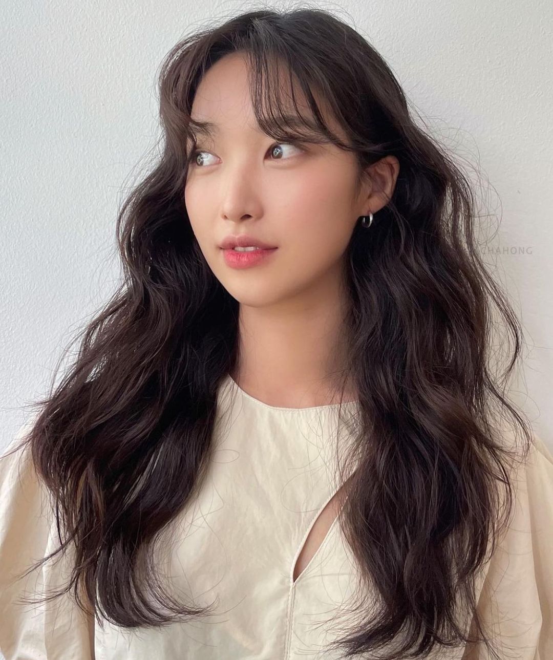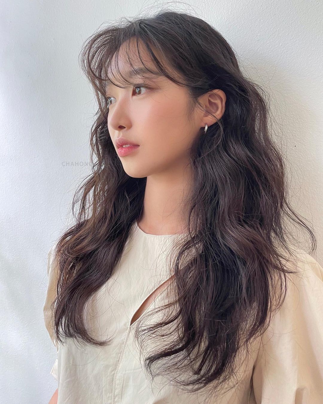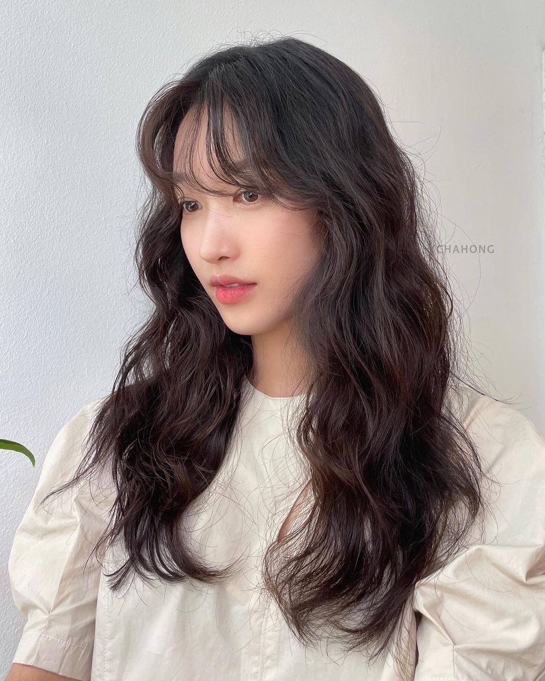 Tóc xoăn sóng to phiên bản 2021 không quá rõ lọn tóc như những năm trước, mà chỉ gợn sóng nhẹ nhàng. Bởi vậy, kiểu tóc này không khiến vẻ ngoài bị "dừ" hay dễ rơi vào cảnh sến sẩm. So kè về độ dịu dàng và nhã nhặn, tóc xoăn sóng to nhỉn hơn tóc xoăn sóng gợn một chút. Đây cũng là lý do mà kiểu tóc này càng hợp với nàng công sở, giúp họ hoàn thiện vẻ ngoài thanh lịch, trang nhã. Muốn hack tuổi hiệu quả hơn, chị em có thể nhuộm nâu và cắt tóc mái lưa thưa. Trong trường hợp không muốn cắt mái quá ngắn, hãy thử kiểu mái bay để tạo độ bồng bềnh, dày dặn hơn cho tóc nhé! Cách làm này cũng giúp vẻ ngoài của bạn trông sang chảnh, sành điệu hơn đấy!