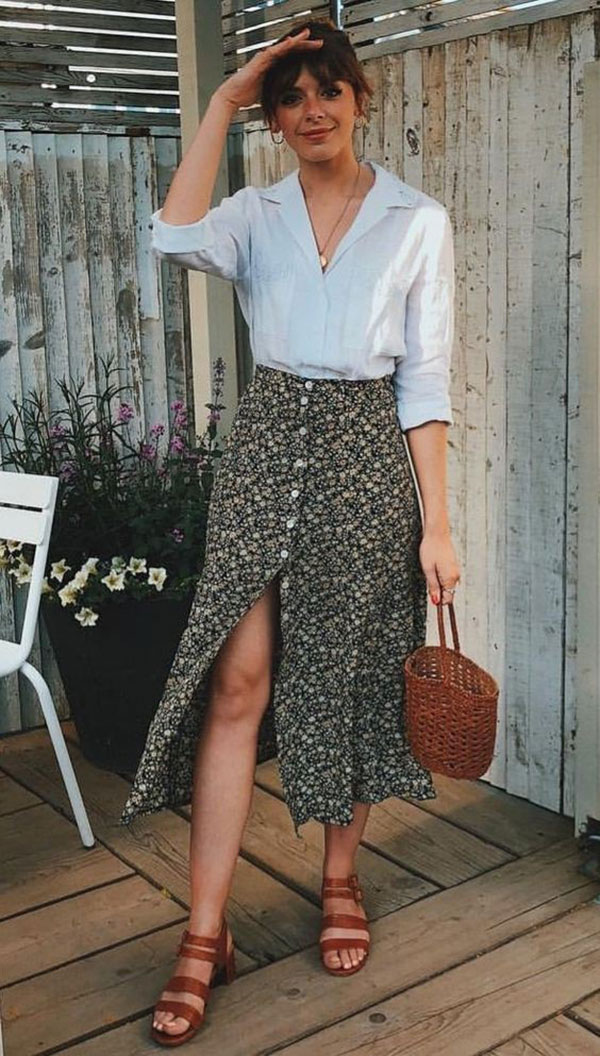 Chân váy cài khuy trước với hàng cúc dọc trải dài phía trước, tạo điểm nhấn nhá ấn tượng cho bộ đồ. Bên cạnh đó, đường cúc dài còn tạo ảo ảnh thị giác khiến chân bạn như dài hơn. Nếu muốn bộ váy trở nên quyến rũ hơn, chị em có thể tháo cúc từ phần trên đầu gối để tạo thành đường xẻ cực duyên dáng quyến rũ. Chân váy cài khuy trước có thể phối hợp với áo sơ mi, áo phông rất linh hoạt.