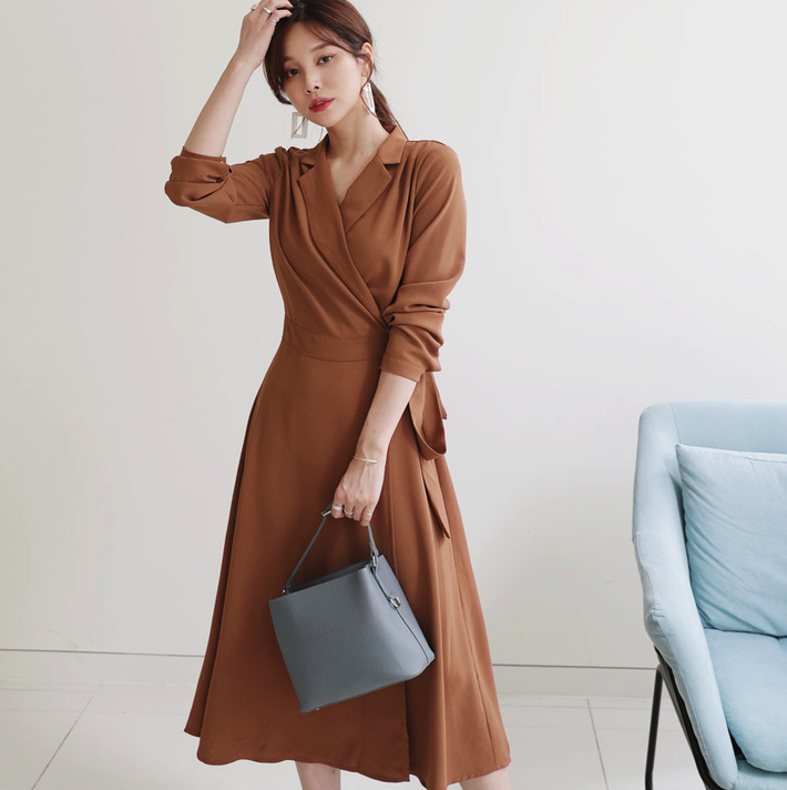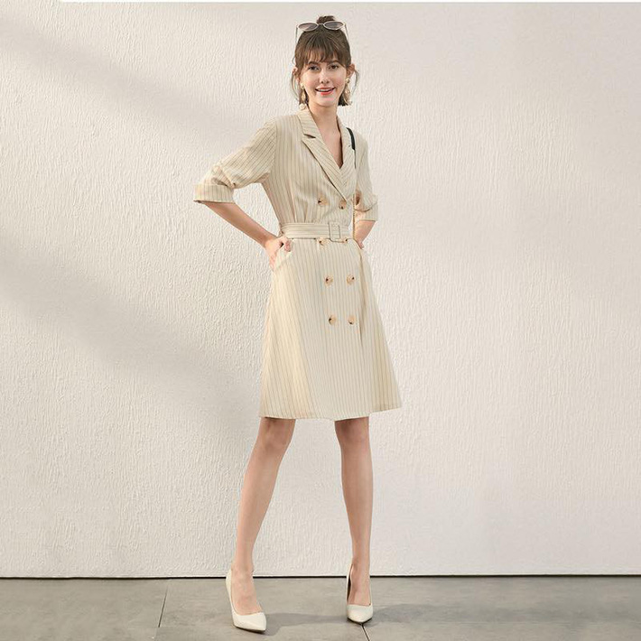 Đây là kiểu váy đậm chất công sở, lai giữa áo trench coat và váy liền, dáng váy này cũng không quá kén người mặc, tuy nhiên để diện đẹp và không bị quá già, hãy chú ý thêm một số phụ kiện như khuyên tai, vòng cổ... Và đừng quên chọn cho mình một đôi cao gót mũi nhọn tôn dáng nhé.