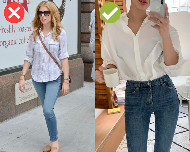 Áo sơ mi chiết eo là item rất hot ở cỡ chục năm trước, vì sự nữ tính và duyên dáng. Tuy nhiên ở thời điểm hiện tại, kiểu áo này đã hoàn toàn lỗi mốt, nên dù mix với bất cứ item nào, bạn cũng sẽ khó hoàn thiện được vẻ ngoài sành điệu. Áo sơ mi chiết eo khi mix với quần skinny jeans không chỉ trông lỗi thời mà còn khiến diện mạo của bạn trở nên tẻ nhạt, và "dừ" hẳn đi. Thay vì diện quần skinny jeans với áo sơ mi chiết eo, bạn hãy thay thế bằng áo sơ mi oversized. Đây là kiểu áo chuẩn mốt, giúp giấu nhược điểm vóc dáng và khi diện cùng quần skinny jeans, bạn chỉ cần không quên thao tác sơ vin, tổng thể trang phục sẽ rất sành điệu, phóng khoáng và trẻ trung.