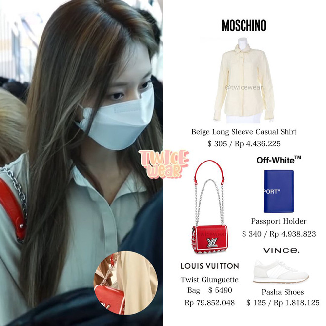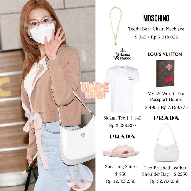 Dù ăn vận đơn giản nhưng cả 4 đều diện toàn những item đắt đỏ đến từ những nhà mốt lớn như Louis Vuitton, Moschino, Prada, Fendi. Ước tính trang phục của Mina, Sana, Tzuyu và Momo lần lượt là 78, 94, 144, 65 triệu đồng.
