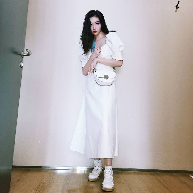 Sunmi là nữ ca sĩ solo sở hữu phong cách độc đáo bậc nhất Kpop. Mặc dù rất mê diện váy, những thiết kế mà cô lựa chọn cũng vô cùng điệu đà, bánh bèo với họa tiết hoa, chi tiết bèo nhún, tay bồng… nhưng Sunmi vẫn luôn toát lên vẻ cá tính, ăn chơi. Bí quyết ở đây của Sunmi chính là kết hợp những chiếc váy điệu với các mẫu giày cá tính như boots, giày sneaker cao cổ… hay tô son đỏ sắc nét. Bên cạnh đó, thần thái sang chảnh của Sunmi cũng góp phần không nhỏ giúp những set váy vóc của cô thêm ấn tượng, hút mắt.