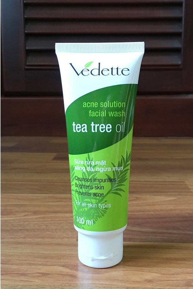 Nếu đang tìm kiếm một loại sữa rửa mặt cho da mụn, da dễ lên mụn thì bạn không thể bỏ qua sản phẩm này đến từ Vedette. Em nó cũng thuộc cùng dòng với em gel chấm mụn thần thánh của hãng, với chiết xuất tràm trà là chủ đạo có tác dụng, kháng viêm, kháng khuẩn, hạn chế sự hình thành mụn. Kết cấu sản phẩm dạng kem đặc, hơi có màu xanh nhạt và mùi tràm trà. Em nó có thể hơi gây khô da một chút sau khi rửa, do đó bạn đừng quên dùng thêm toner và kem dưỡng để bổ sung độ ẩm cho da.