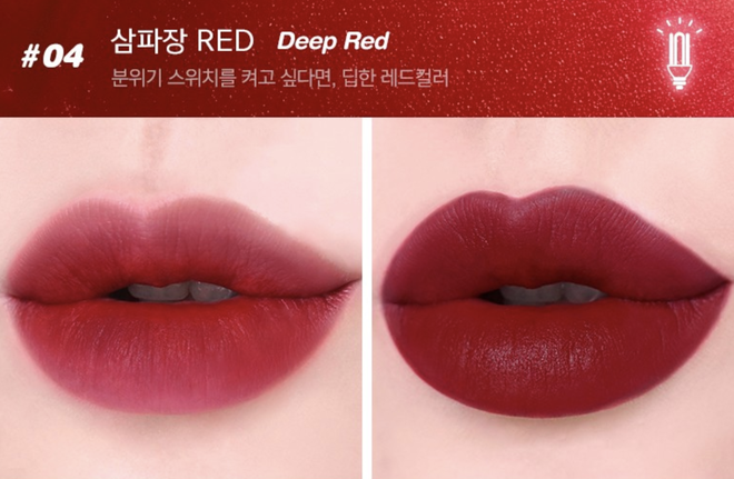 Deep Red là tông đỏ hồng đất, có chút ánh tím nhẹ, tạo nên vẻ bí ẩn, quyền lực, sexy. Dòng son Blur Velvet Tint được hãng giới thiệu là chất son kem xốp mịn, che phủ tốt rãnh môi, khi lên môi cho màu chuẩn đều và để lại lớp finish mỏng nhẹ như không.