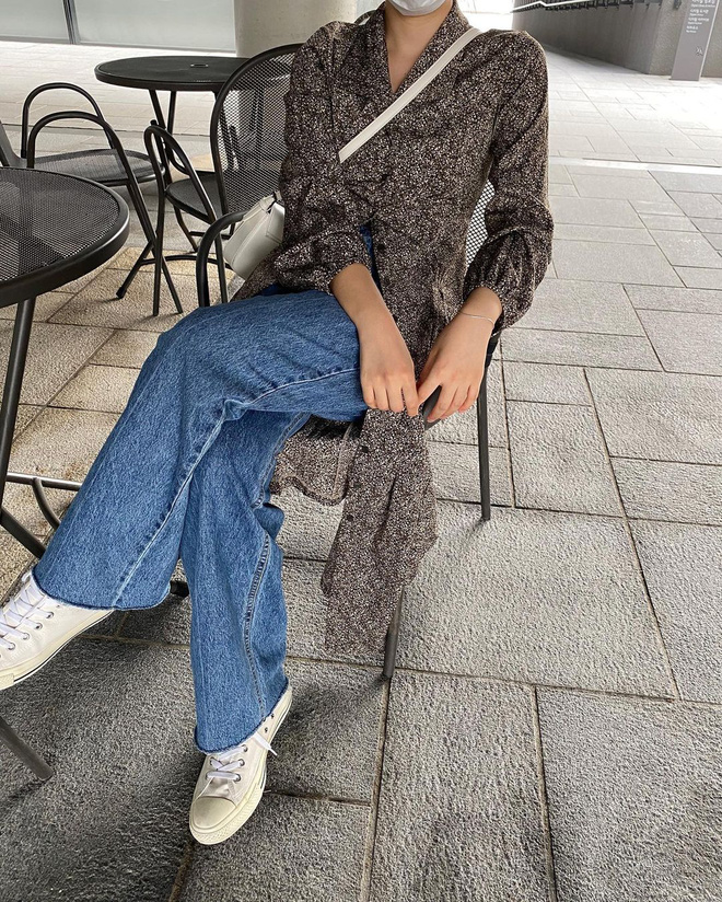 Nếu thấy diện váy hoa hơi bánh bèo và muốn một cái gì đó cá tính và thú vị hơn thì bạn thử mix cùng quần jeans xem sao. Nghe thì có vẻ kỳ cục nhưng đây là một kiểu mix đồ được gái Hàn khá ưa chuộng đấy nhé. Với cách kết hợp này thì chiếc váy hoa sẽ chẳng còn nhàm chán nữa, trông vẫn siêu yêu mà lại đầy phá cách. Tuy nhiên có một lưu ý nhỏ đó là công thức layer “khó nhằn” này chỉ dành cho mấy bạn có dáng người thanh mảnh và cao ráo mà thôi.