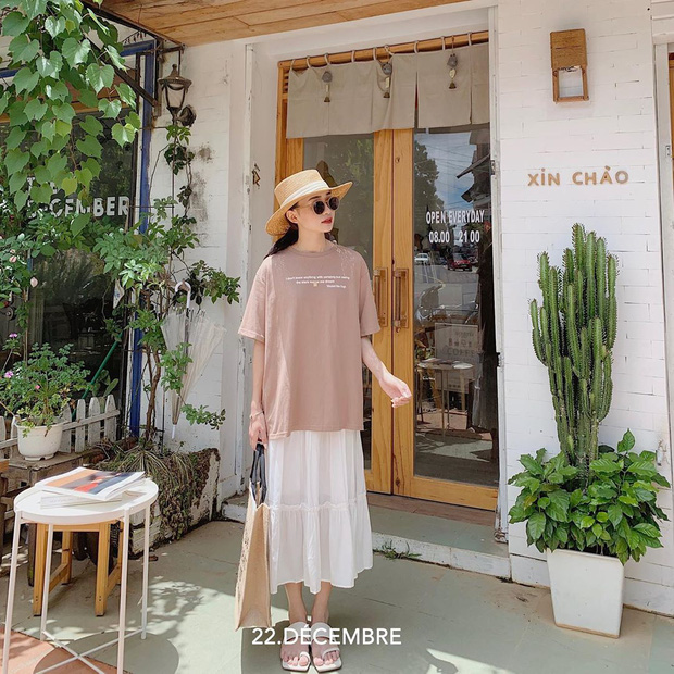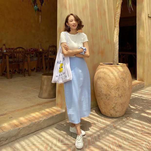 Một công thức mix chân váy đơn giản khác mà hội mặc đẹp áp dụng bét nhè vẫn hay ho chính là phối với áo phông rộng rãi, thoải mái. Dựa trên "công thức" này thì bạn có thể diện váy với các kiểu áo phông màu sắc khác nhau. Dù là sơ vin gọn gàng hay để hẳn áo ra phía ngoài phóng khoáng cũng đều trông "ok lah".