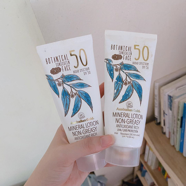 Cuối cùng, không thể bỏ qua Botanical Tinted Sunscreen nếu bạn là một cô nàng thích kem chống nắng kiềm dầu "ok lah", nhẹ mặt và không gây bết dính. Sản phẩm đình đám của Australian Gold là kem chống nắng vật lí không mùi, không paraben, chiết xuất thực vật giàu chất chống oxy hoá và được kiểm chứng bởi các bác sĩ da liễu nên bạn có thể yên tâm khi sử dụng mà không lo kích ứng gì. Em ấy làm đều màu da tốt, để lại lớp finish siêu đẹp trên da. Với những nàng da ít khuyết điểm thì bạn có thể sẽ chẳng cần makeup thêm vì nhờ em này mà da xịn đẹp hơn rồi đấy!