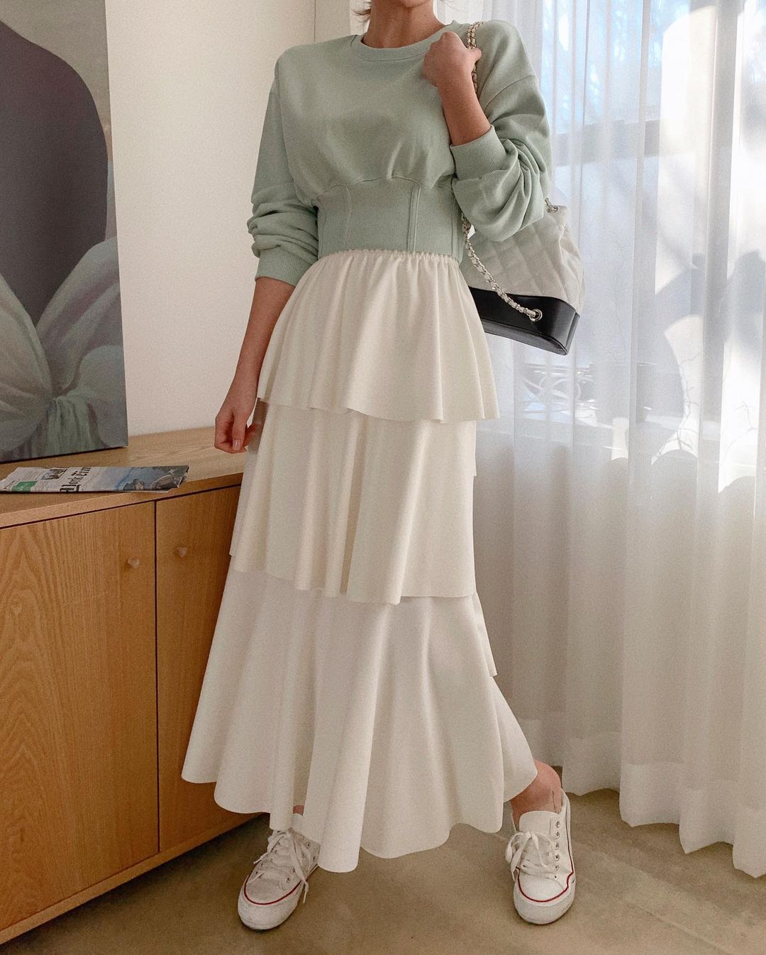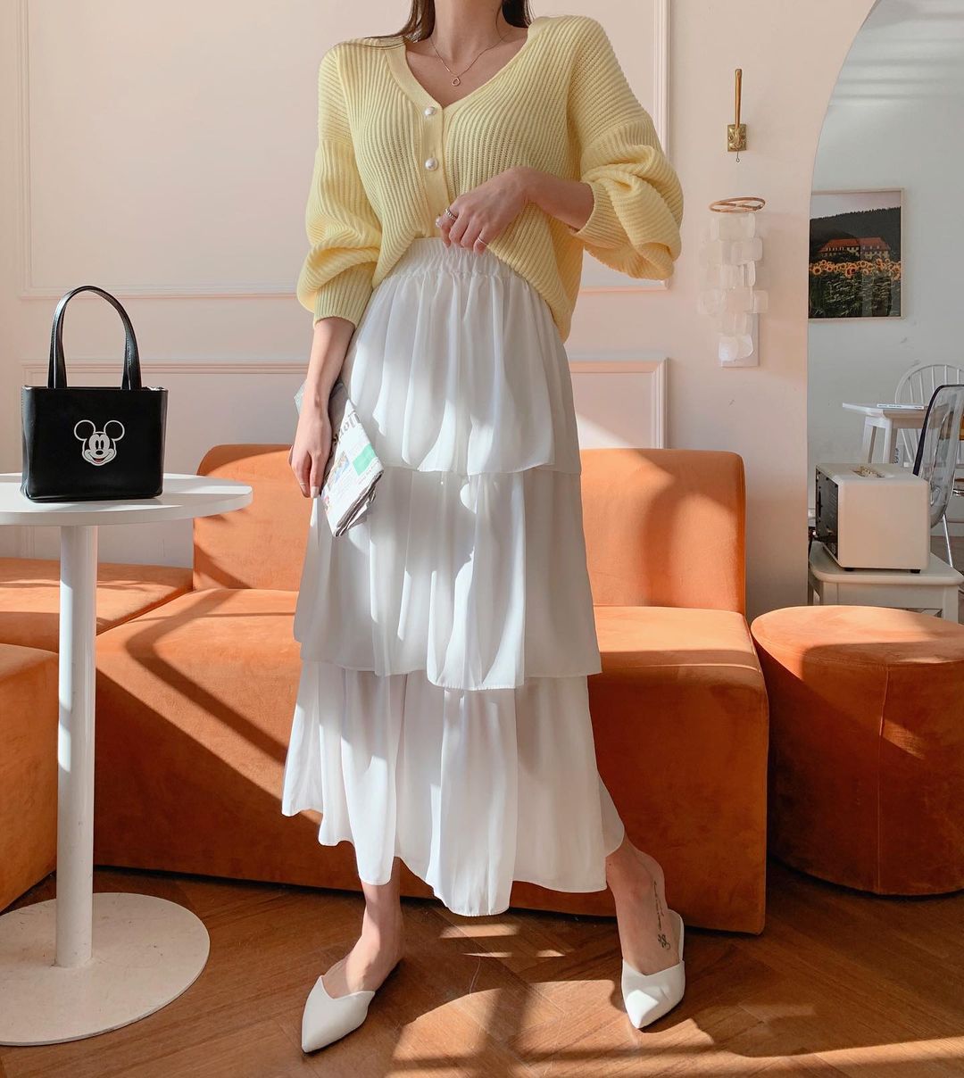 Năm ngoái, chân váy xếp tầng tỏ ra khá mờ nhạt, bị lấn át bởi nhiều kiểu chân váy hot hit. Tuy nhiên đầu năm nay, chân váy xếp tầng lại được không ít các quý cô Hàn Quốc chọn diện, hứa hẹn sẽ trở thành lựa chọn lý tưởng cho chị em hoàn thiện style năm 2021. Kiểu chân váy với chi tiết bèo nhún xếp tầng này tạo điểm nhấn nổi bật cho tổng thể trang phục, chị em chỉ cần mix với những kiểu áo đơn giản là outfit đã điệu đà, ấn tượng và hút mắt lắm rồi. Chân váy xếp tầng cũng là món đồ không hề kén dáng, chị em nào cũng có thể diện đẹp.