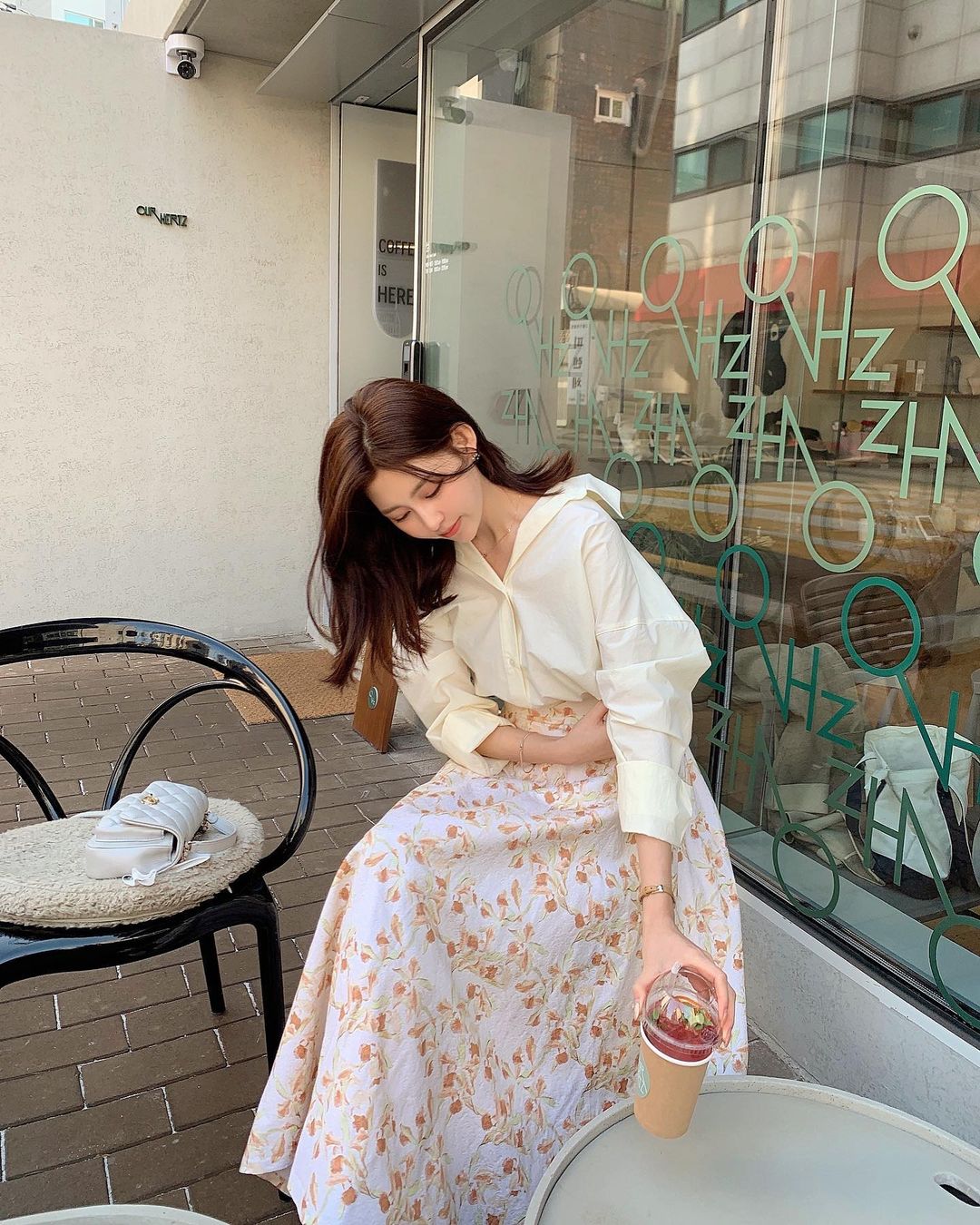 Mùa Xuân – Hè diện chân váy hoa là đúng điệu. Item quen thuộc này sẽ đem đến cho chị em vẻ ngoài tươi xinh, trẻ trung và hài hòa tuyệt đối với không khí rộn ràng của mùa mới. Các quý cô xứ Hàn thường ưu tiên những chiếc chân váy hoa có phối màu nhã nhặn, mix cùng những kiểu áo và giày dép đơn giản. Như thế, người diện sẽ có được outfit đủ tươi xinh nhưng cũng chẳng kém phần tinh tế và trang nhã.