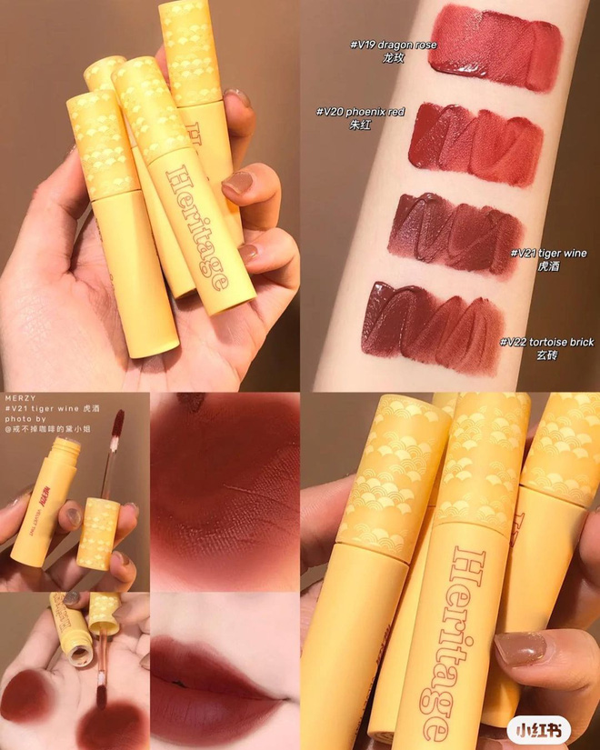 Hot không kém son nhà Romand còn có dòng son kem lì The Heritage Velvet Tint của Merzy nữa. Xịn mịn hơn những người "chị em" trước đó, The Heritage Velvet Tint sở hữu thiết kế cổ điển, vỏ ngoài đẹp sang, thực sự làm nhiều cô gái liêu xiêu từ cái nhìn đầu. Nhưng hơn thế, son còn có bảng màu rất "cuốn", tập trung vào những tông son trầm mà quyến rũ như đỏ rượu, đỏ nâu gạch, hồng đỏ mận, đỏ cam gạch. Chất son cũng được cải tiến lên màu chuẩn hơn, nhẹ môi và có độ bám tốt. Son cũng ít dây ra khẩu trang và khi trôi để lại lớp stain màu ổn. Với ngần ấy điểm cộng nhưng son chỉ có giá chưa đến 200k, "múc" ngay thôi các nàng ơi!