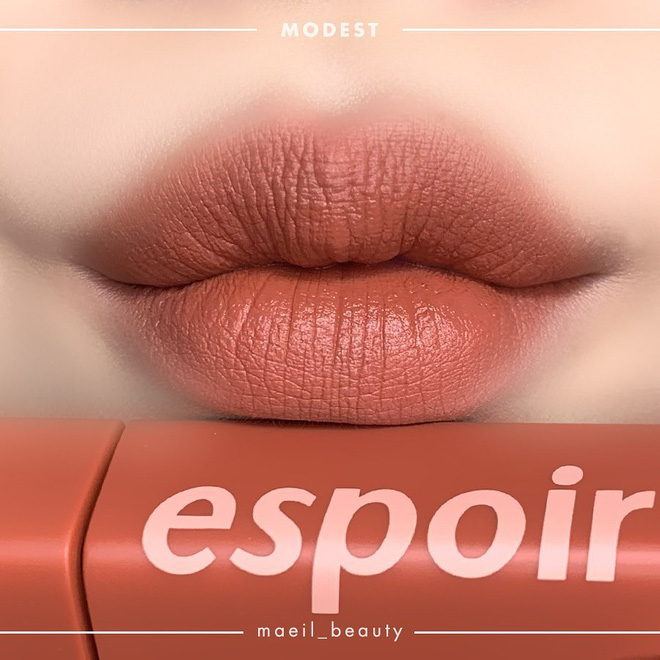 Cùng tên gọi Modest với thỏi son cam đất huyền thoại được Espoir ra mắt cách đây khá lâu nhưng Modest phiên bản son kem velvet mới coóng này lại là bình cũ rượu mới khi bổ sung thêm sắc nâu nhiều hơn, biến thỏi son thành một màu cam nâu gạch vô cùng thời thượng làm chị em xiêu lòng.
