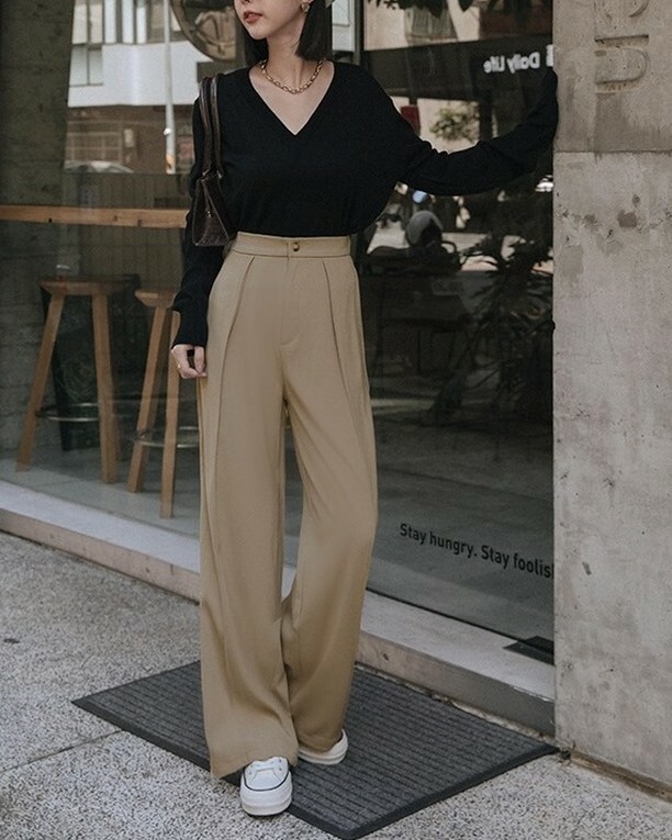 Hiệu nghiệm đối với mọi vóc dáng, công thức này chính là "bảo bối" dành cho các nàng thấp bé muốn cơi nới chút chiều cao cho mình. Chọn một kiểu quần ống rộng dài đến mắt cá chân với phần cạp cao trên vòng 2 cùng áo dáng lửng/ ngắn, nhìn bạn như thể cao thêm tới chục cm chứ chẳng ít. Thậm chí với nàng vòng 2 thiếu thon gọn, công thức này còn che bụng mỡ rất hiệu quả, đó chính là lý do vì sao các sao nữ Kpop lại chuộng combo này đến vậy.