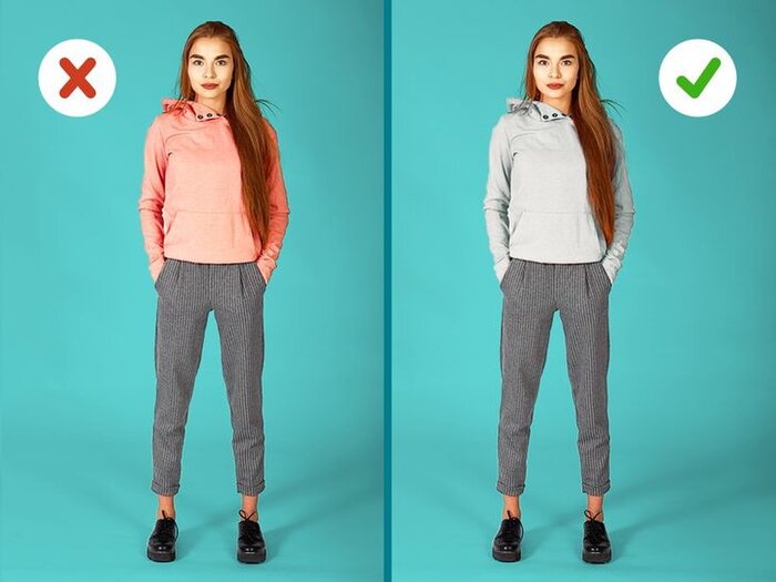 Nếu bạn mặc theo phong cách tương phản, áo màu sáng và quần màu tối, tách cơ thể ra làm đôi thì sẽ làm dáng người tổng thể của bạn bị thiếu chiều cao.