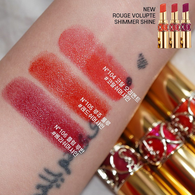 Thêm một gợi ý dành cho bạn ở phân khúc son 800k còn có Rouge Volupte Shimmer Shine với 3 màu mới toanh 104, 105 và 106 mà YSL vừa trình làng. Son lên môi cho hiệu ứng satin matte chuẩn chỉnh, vừa lên màu "ok lah" vừa để lại lớp finish mịn màng, "trong trong", lấp lánh nhẹ, thật sự có thể nâng độ sang chảnh, thu hút của bất cứ cô gái nào khi diện lên.