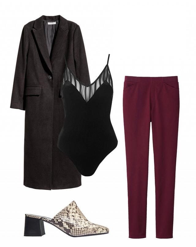 | Áo khoác chắn bụi + bodysuit + tregging + dép mules: Chiếc áo bodysuit 2 dây cá tính được tận dụng để mix với tregging dáng rộng và áo khoác dài. Những đôi dép mules cao gót làm hoàn thiện set đồ thu. |