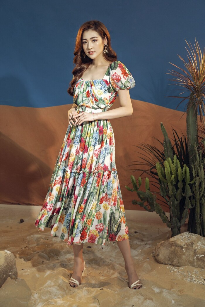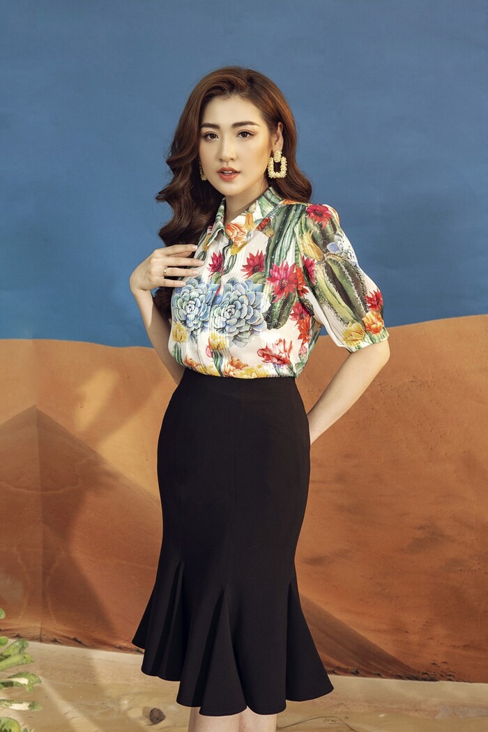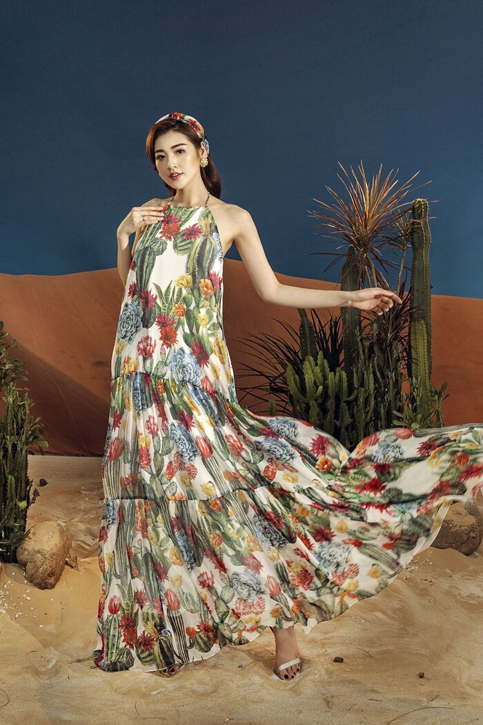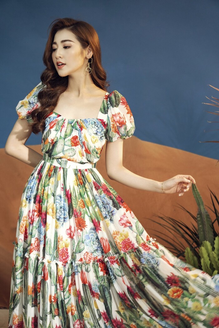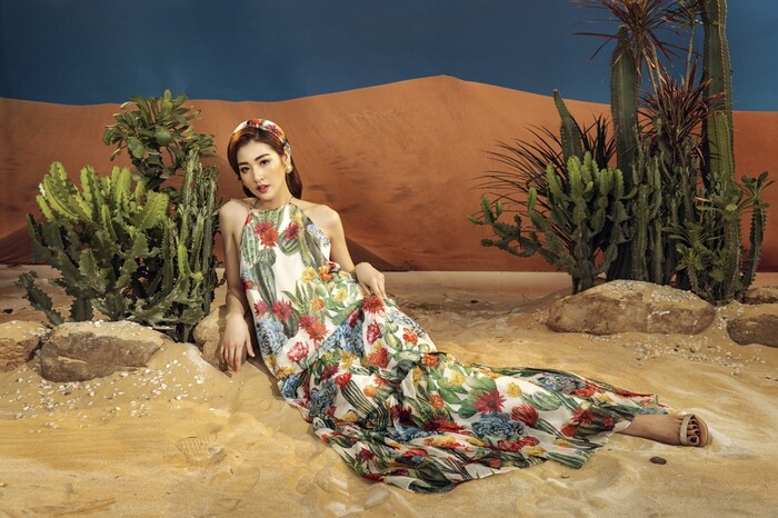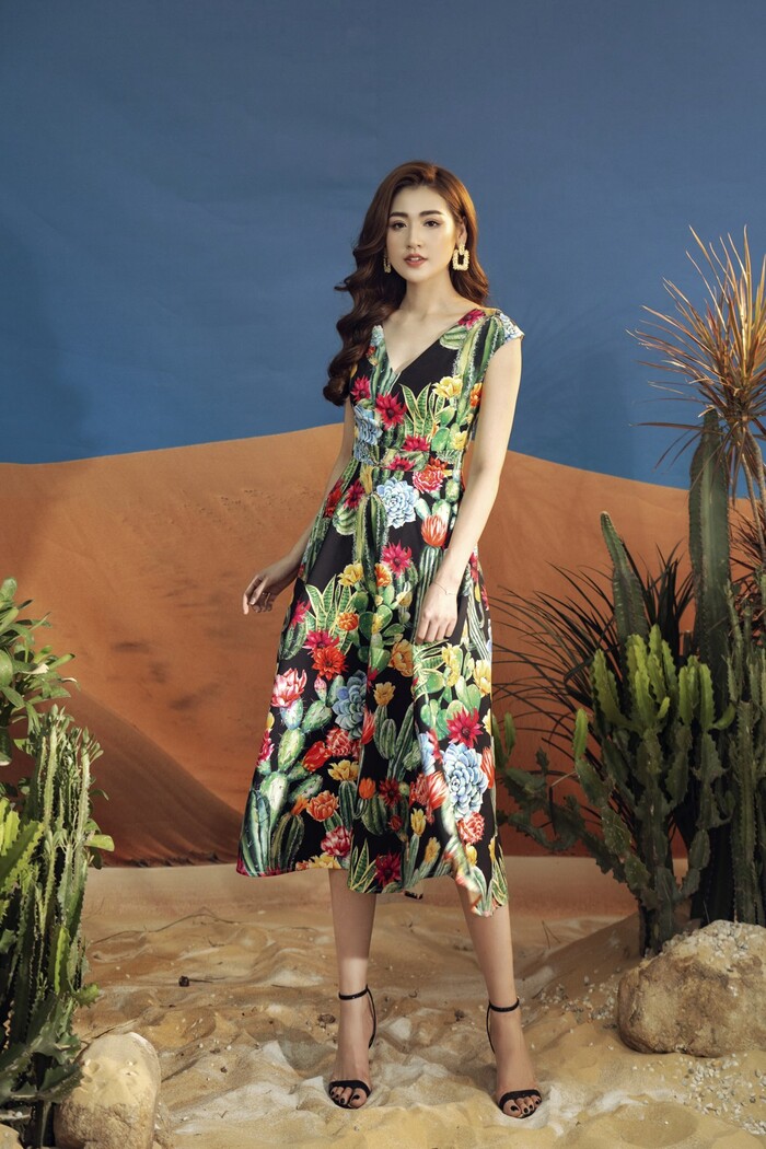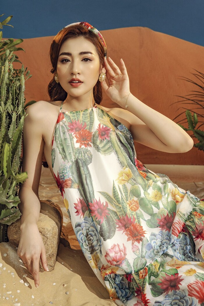 Khoác lên mình những thiết kế trẻ trung, hiện đại với các gam màu, họa tiết thiên nhiên tươi sáng, tràn đầy sức sống, nhan sắc Tú Anh càng thêm rực rỡ. Trong những kiểu đầm midi, maxi mềm mại nhẹ nhàng, quần short khoe chân dài, áo sơ mi thanh lịch, Tú Anh đã tạo nên hình ảnh quý cô theo phong cách retro pha nét lãng mạn.
