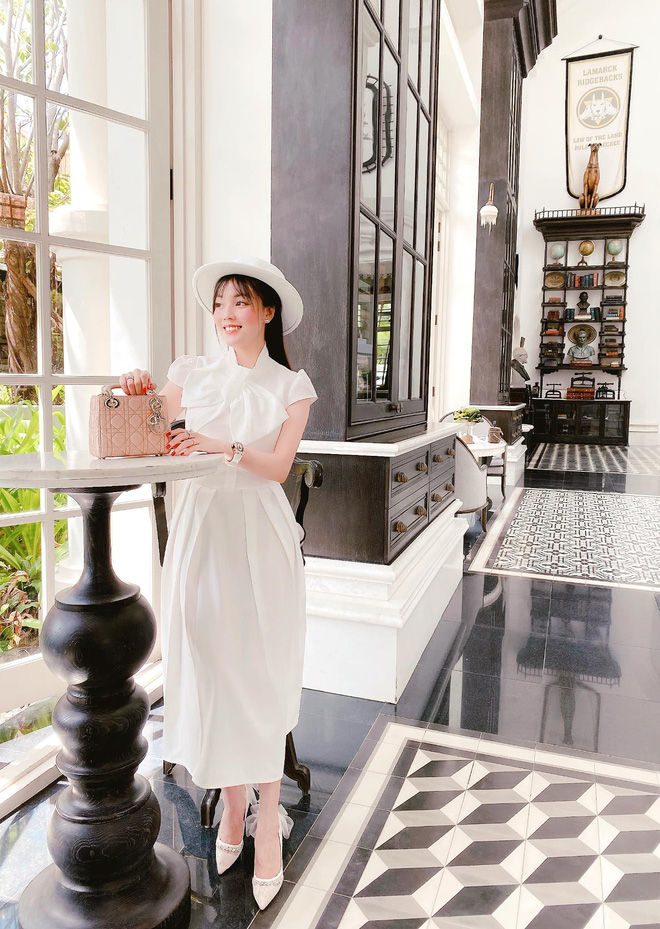 Để cân bằng lại thì dạo gần đây, Âu Hà My cũng chăm diện váy bánh bèo kín hơn chút. Đa phần, cô sẽ chọn những bộ có tông trắng hoặc nude nhã nhặn, vừa sang chảnh vừa thanh tao, lại hợp với phong cách điệu đà, nữ tính của cô giảng viên.