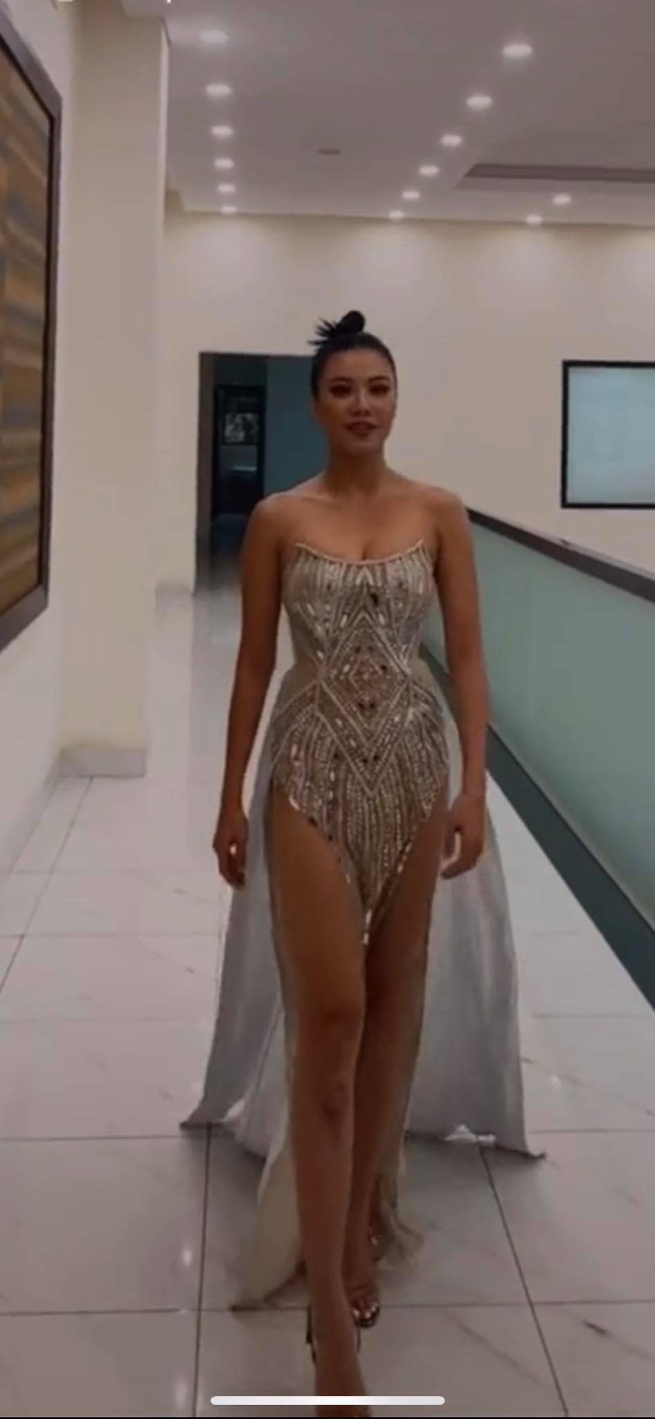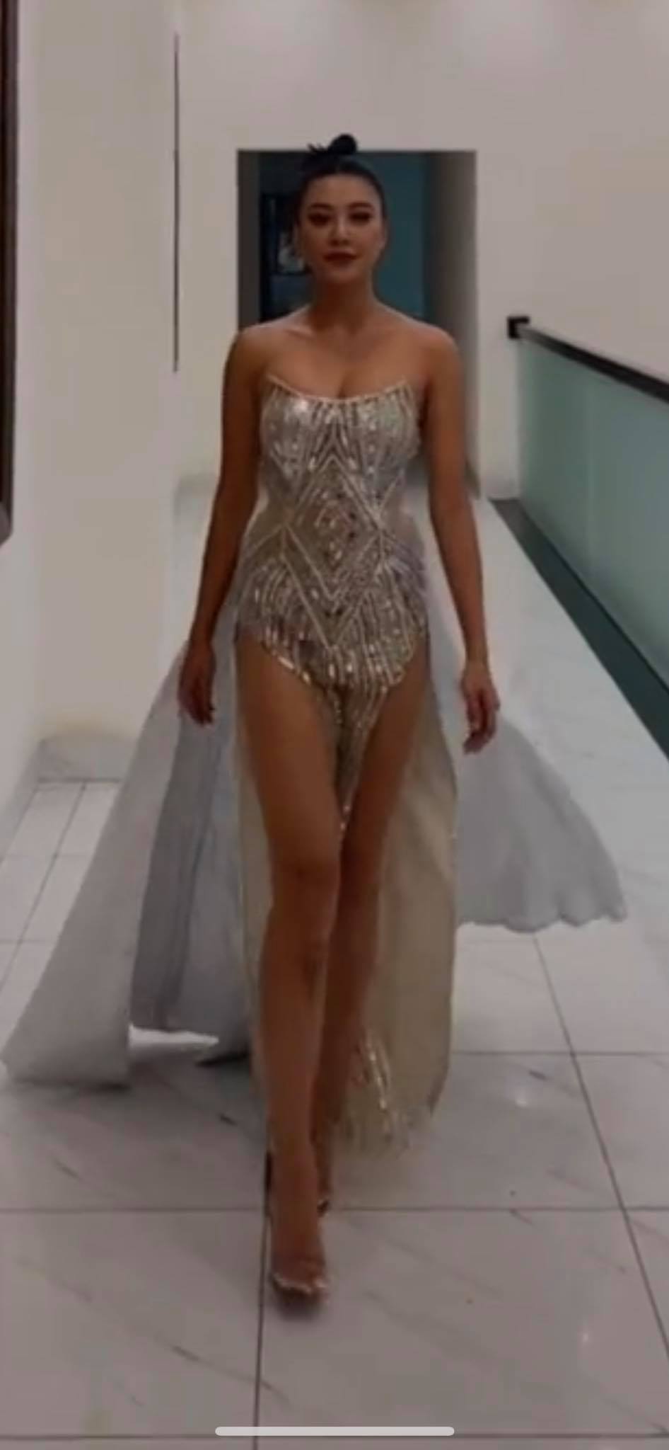 Nhìn thế thôi chứ xét về độ sexy, hiểm hóc thì Hayley Bieber vẫn còn thua một nàng Á hậu Vbiz. Bộ đầm của Hayley Bieber ít nhiều còn có thêm chi tiết ren xuyên thấu để che chắn, còn thiết kế mà Á hậu Kim Duyên từng diện cũng có đường xẻ tứ tung như vậy nhưng không hề có lớp vải xuyên thấu nào "níu kéo" tà váy cả. Hình ảnh của nàng Á hậu trước thềm thi Miss Universe khiến dân tình không khỏi bất ngờ.