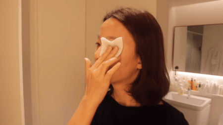 Để làm sạch triệt để cho da, bước đầu tiên cô Joohee sẽ tẩy trang để làm sạch hoàn toàn lớp makeup bám sâu trên da. Đầu tiên cô sẽ dùng bông thấm nước tẩy trang để lau sạch mascara, kẻ mắt lâu trôi; sau đó massage với dầu tẩy trang. Bước này tuy mất thời gian nhưng sẽ giúp cô làm sạch triệt để lớp makeup bám trụ trên da.