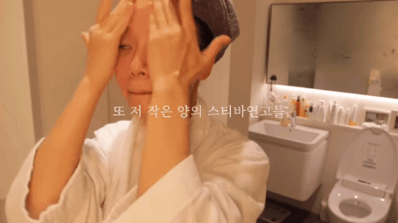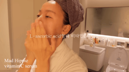 Nếu muốn chống lão hóa toàn diện cho da thì bạn không thể bỏ qua việc dùng serum vitamin C. Sau bước rửa mặt, cô Joohee sẽ bôi vitamin C. Cô thường nhỏ một chút serum vào lòng bàn tay rồi áp đều lên da giúp serum thẩm thấu đều.