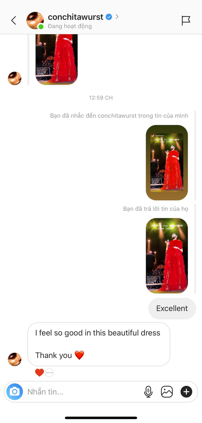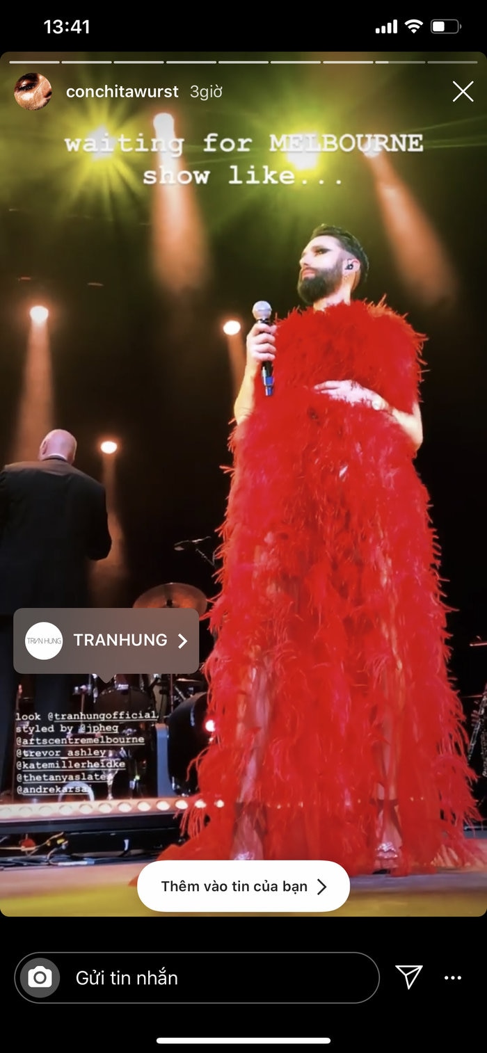 Trang phục mà Conchita chọn là thiết kế đầm tulle silk và lông vũ đỏ nằm trong BST Spring Summer 2020 do NTK Trần Hùng mới giới thiệu đến công chúng vào tháng 9 năm ngoái.
