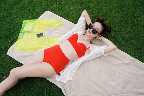 Nữ ca sĩ Vy Oanh có hình thể rất nóng bỏng, càng được tôn lên bởi sắc đỏ rực rỡ của chiếc áo tắm. |