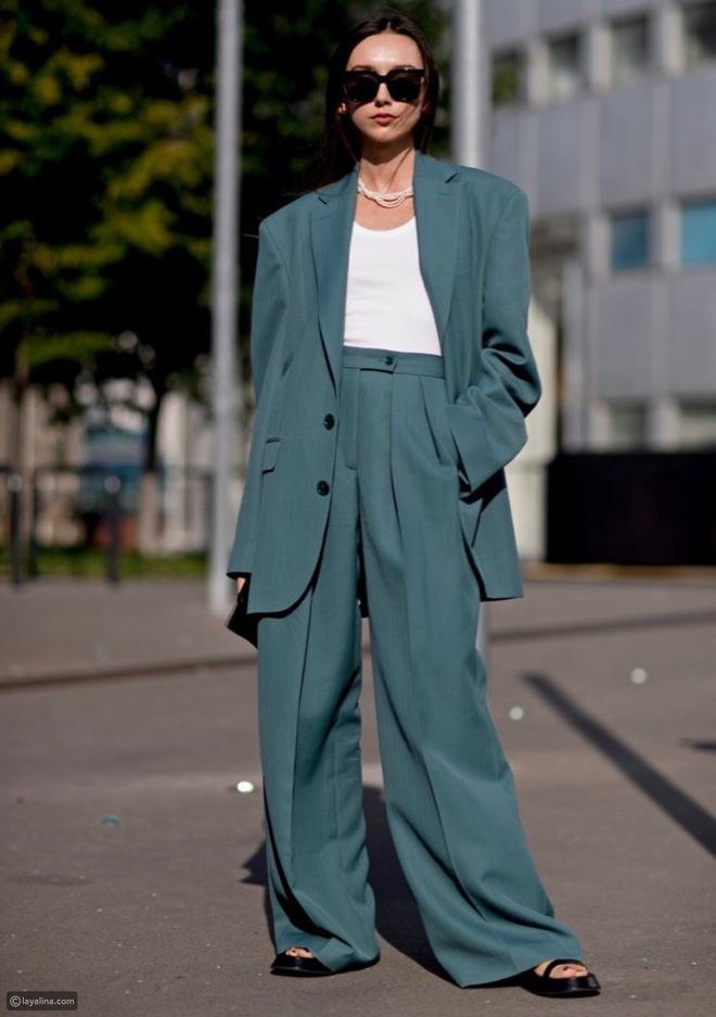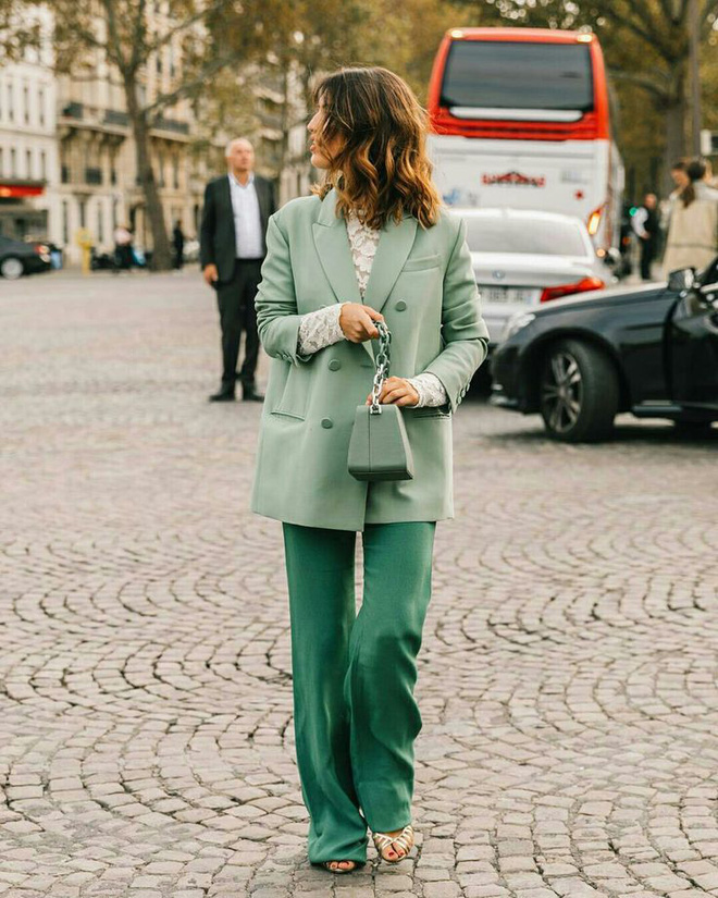 Street style của các nàng It girl khi biến tấu với blazer còn ghi dấu 1 công thức rất thú vị, chính là phối blazer với quần cùng tông màu. Outfit của bạn trông sẽ thanh lịch, phóng khoáng hay thoải mái, năng động sẽ phụ thuộc khá lớn vào cách bạn chọn phom dáng trang phục và phụ kiện đi kèm. Những mẫu quần ống suông, ống rộng đi với sandal, giày cao gót sẽ biến bạn thành quý cô lịch thiệp, còn thiết kế quần ôm, giày sneaker sẽ giúp bạn trở nên tràn ngập năng lượng
