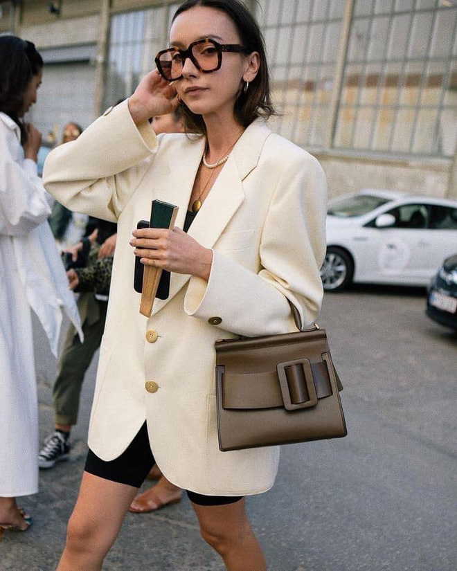 Biker shorts là 1 trong những item có thể diện đẹp cả 2 mùa hè - thu. Với cách phối này, các nàng It girl thường mặc bên trong áo crop top để thêm "hack" dáng, đồng thời khiến cơ thể thêm phần phóng khoáng, hiện đại. Thiết kế blazer khi mix cùng biker shorts thường có thêm phần độn vai để vẻ ngoài thêm phần năng động, khỏe khoắn