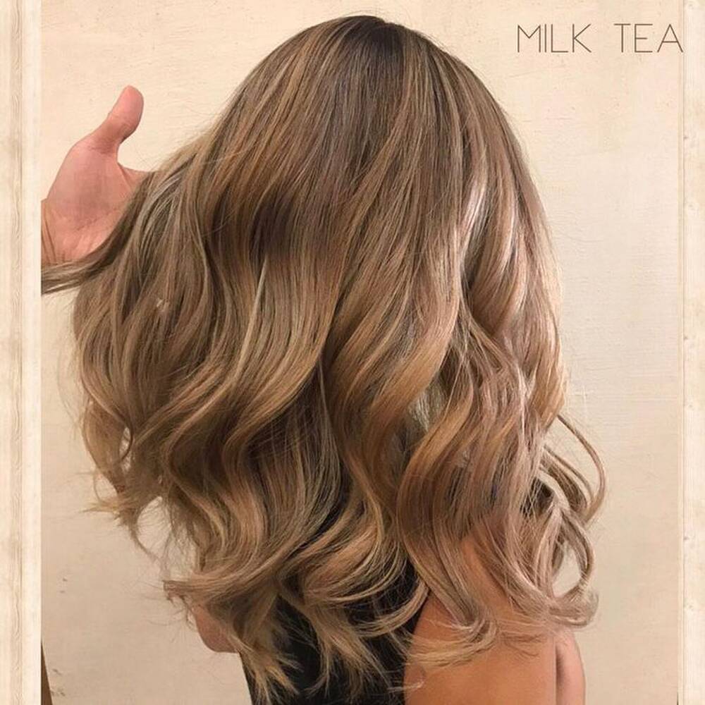 Tóc nhuộm màu trà sữa là màu sắc pha trộn giữa màu nâu và màu xám khiến tóc có độ bóng khói nhẹ tạo cảm giác vừa huyền ảo sang chảnh lại có sự ngọt ngào như một ly trà sữa.