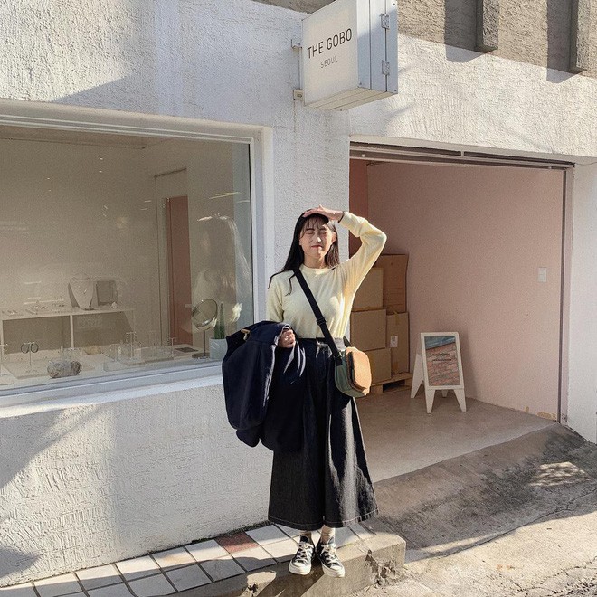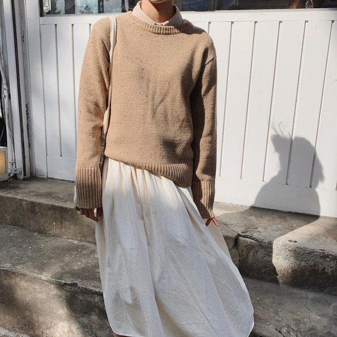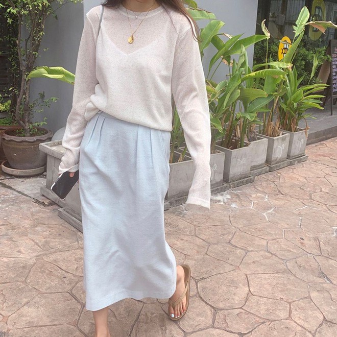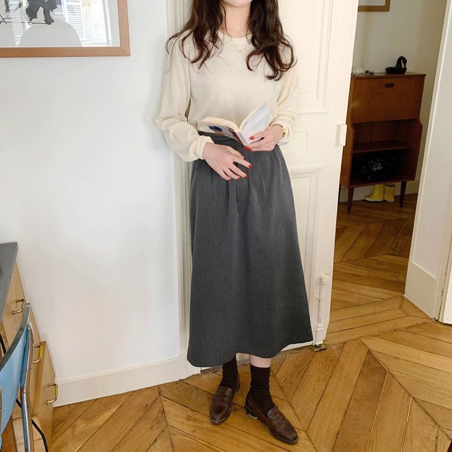 Giả dụ, bạn không quen diện áo nỉ hay áo len nặng nề thì hãy phối chân váy dài với áo dài tay cũng hay ho phết, vừa giữ ấm đủ tốt vừa thoải mái, nhẹ nhàng hơn. Tuy nhiên, bạn nên diện theo style sơ vin để chắc rằng vẻ ngoài không luộm thuộm.