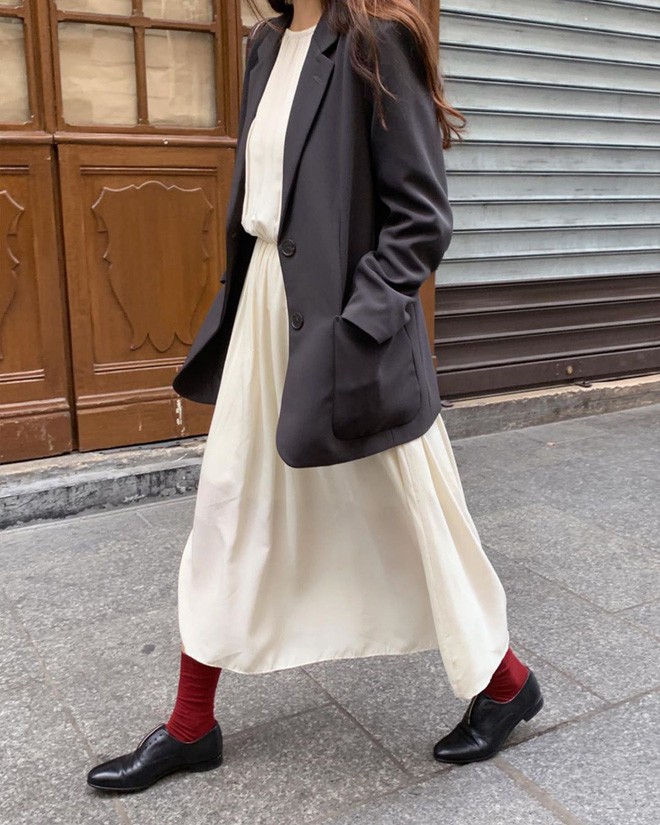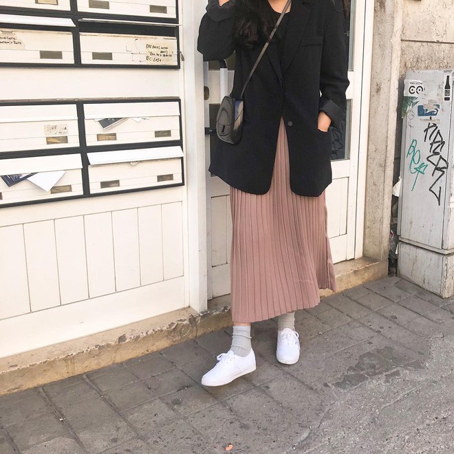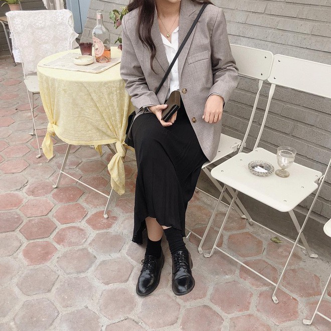Nếu thích kiểu phối layer và muốn cây đồ trông “chanh sả” đôi chút thì cũng với công thức trên, bạn chỉ cần thêm thắt blazer là chuẩn chỉnh. Cả áo phông, blazer và chân váy midi đều là những items “dễ tính” nên chuyện mặc đẹp gần như là điều hiển nhiên.