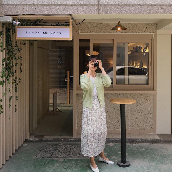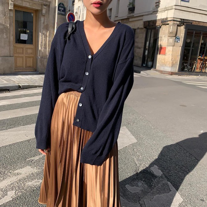 Nhẹ nhàng hơn là sự kết hợp giữa cardigan và chân váy. Với tuyệt chiêu này, bạn có thể diện độc một chiếc cardigan rồi sơ vin thanh lịch hoặc phối với áo phông và khoác nhẹ cardigan bên ngoài. Bạn sẽ trông thướt tha, duyên dáng lắm nếu ra ngoài trong bộ trang phục đậm chất quý cô này cho xem.