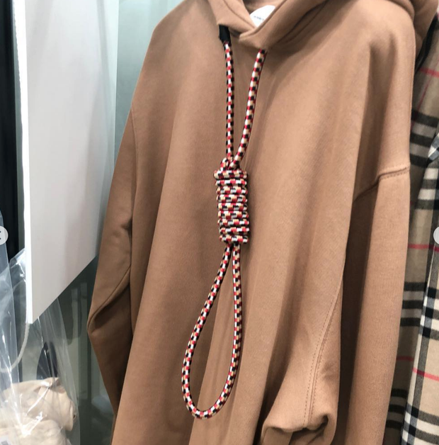 Năm 2019, Burberry hứng chịu chỉ trích dữ dội vì mẫu thiết kế áo hoodie với phần dây rút y hệt thòng lọng treo cổ. Thậm chí, đến chính Liz Kennedy, chân dài diễn trong show này cũng phải lên tiếng phản đối và bày tỏ sự bức xúc đến cùng cực.