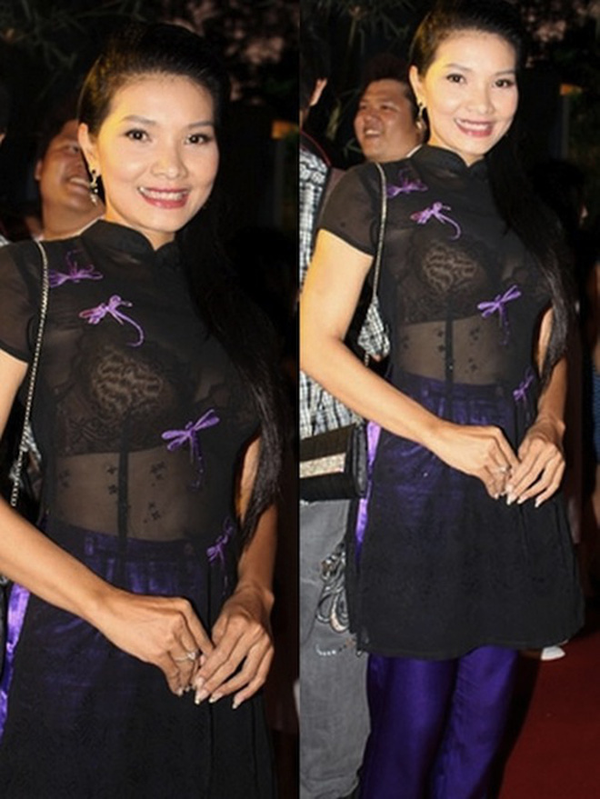 Diễn viên Phương Oanh từng để lộ lỗi trang phục khi lớp áo lót sáng màu hiện rõ bên dưới lớp áo mỏng