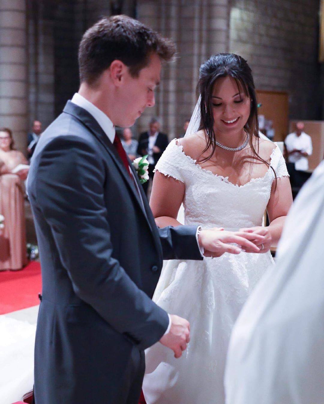 Marie Chevallier xinh đẹp, duyên dáng trong bộ váy cưới chính thức. Thiết kế váy trễ vai dáng xòe bồng bềnh điểm xuyết hoa văn thêu ren nhẹ nhàng tinh xảo. So với các thiết kế váy cưới Hoàng gia, bộ váy của Marie Chevallier đơn giản bình dân hơn hẳn.