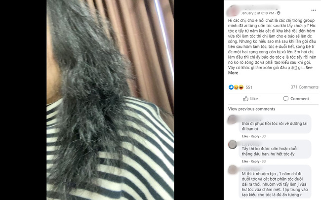 Sau khi làm xong, mái tóc nhìn khá ổn áp với lọn xoăn ở phần đuôi tóc, tuy nhiên chỉ sau 1 lần gội đầu thì trở nên xác xơ và thiếu sức sống. Ngay sau khi đăng tải bức ảnh mái tóc của mình, cô nàng này đã nhận được nhiều bình luận và những lời khuyên của hội chị em.