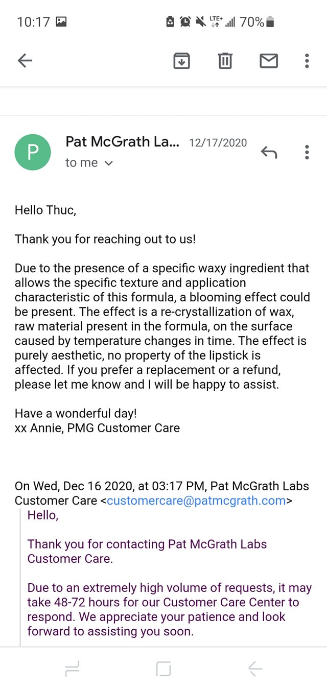Blogger Municamonica cũng đã gặp phải tình trạng tương tự với mảng trắng dày đặc cả thân son, cô nàng đã email cho hãng và nhận được phản hồi từ Pat McGrath, nguyên nhân của việc này là do sáp son và nó không ảnh hưởng gì đến chất lượng cây son.