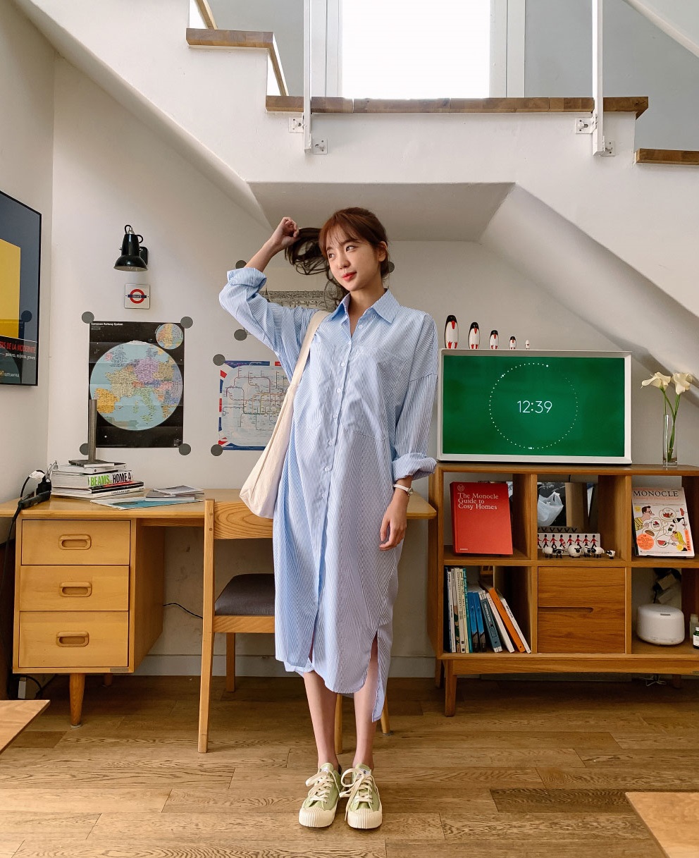 Váy sơ mi có nét gì đó rất cá tính, năng động nên đặc biệt "ăn rơ" với những đôi sneaker khỏe khoắn. Bộ đôi này chắc chắn sẽ đem đến cho các chị em vẻ ngoài trẻ trung nhưng không bị "cưa sừng làm nghé". Công thức váy sơ mi + giày sneaker còn đủ lịch sự để có thể diện đến môi trường công sở.