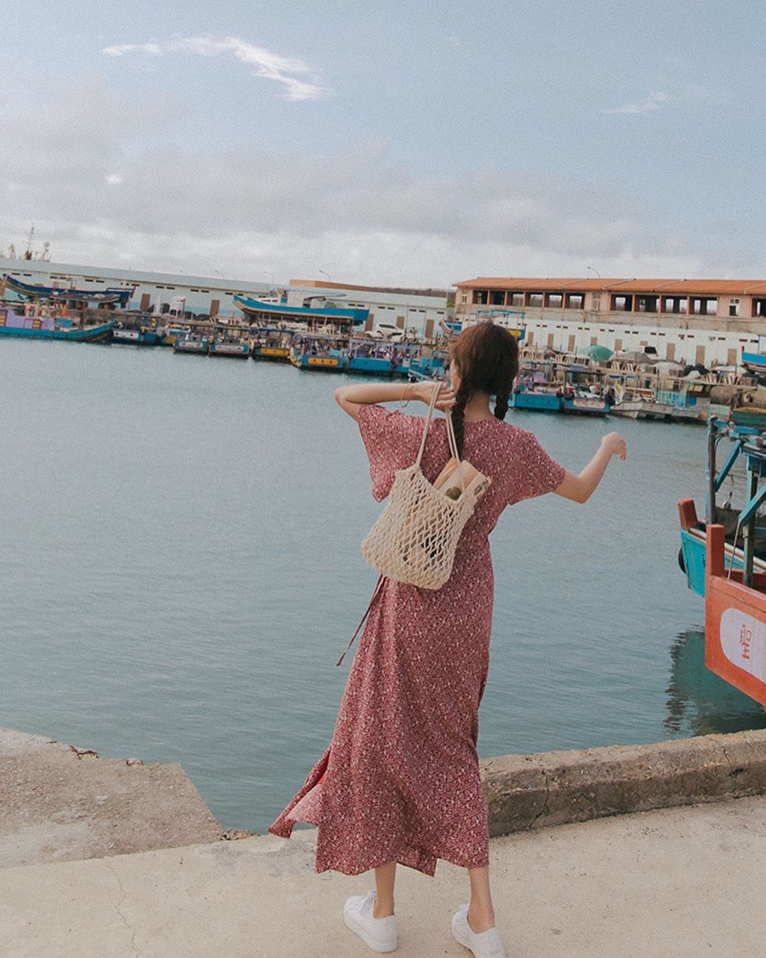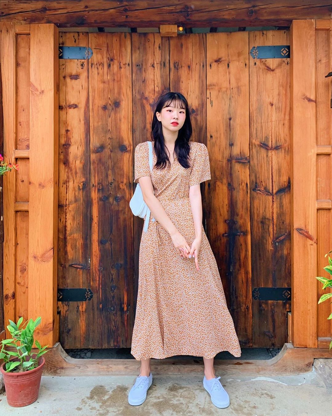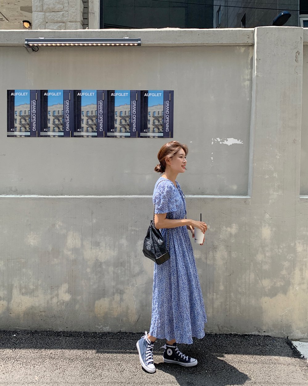 Dù đậm chất bánh bèo, váy hoa vẫn là một trong những "bạn đồng hành" lý tưởng của giày sneaker. Sự xuất hiện của đôi giày thể thao khỏe khoắn sẽ nâng điểm sành điệu, năng động cho cả tổng thể trang phục; thậm chí có thể "cứu" set váy khỏi cảnh bị sến sẩm hóa. Muốn vẻ ngoài đạt ngưỡng xịn đẹp level max, bạn hãy chọn váy hoa nhí cổ chữ V rồi kết lại bằng một đôi sneaker trắng.