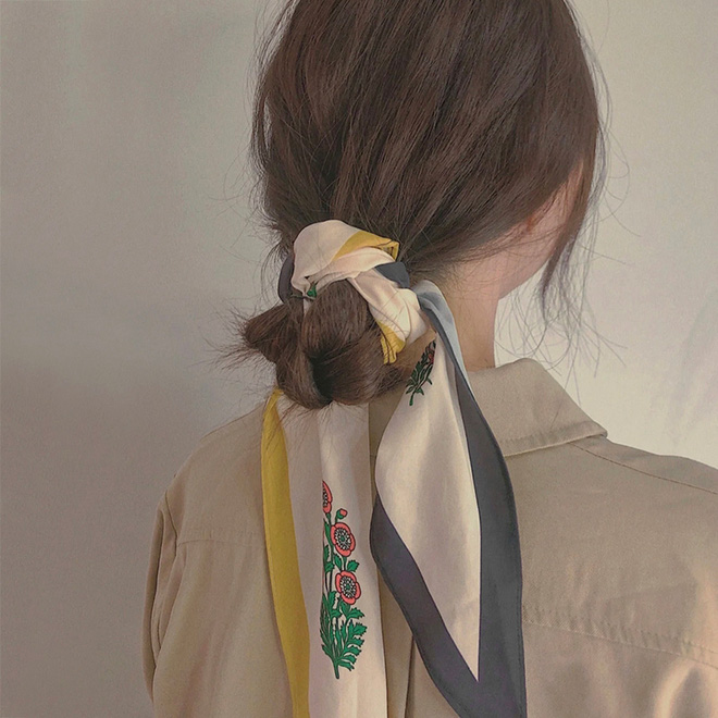 Khăn lụa - món phụ kiện hot từ năm ngoái tới năm nay qua màn lăng xê không những sao Hàn mà còn cả sao Việt. Tóc buộc bằng khăn lụa đem đến vẻ ngoài dịu dàng, nữ tính mà vẫn đầy sang trọng. Ngoài buộc thấp, khăn lụa còn có thể buộc nửa đầu, búi tóc hay dùng với tóc tết thì cũng cực xinh luôn.