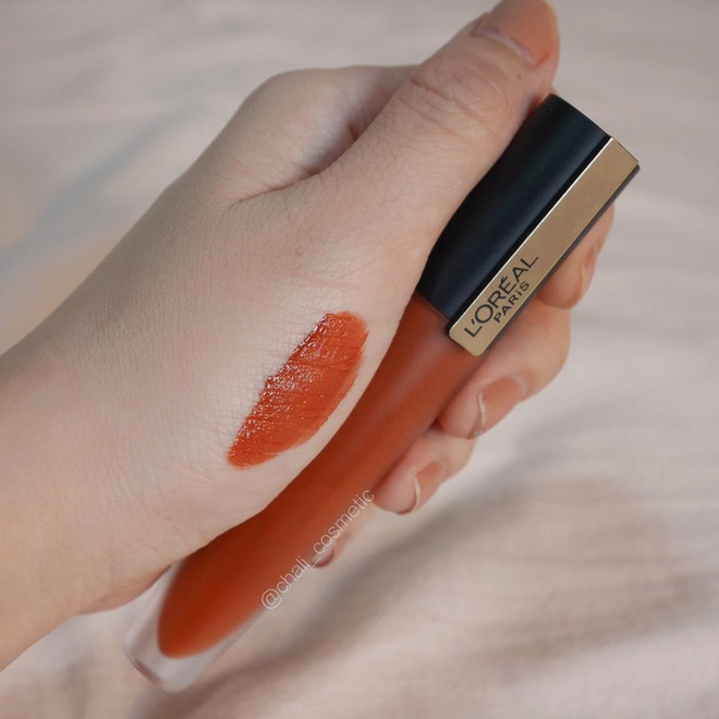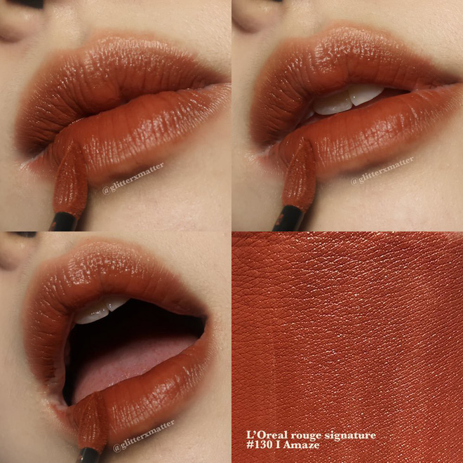Ứng viên son cam đất đáng chú ý nhất lúc này chính là son kem lì L'Oréal Paris Rouge Signature màu 130 I Amaze. Chất son mịn mượt, dễ tán đều lại nhẹ tên trên môi nhưng lại có độ lên màu cực chuẩn, đã vậy còn bền màu lên tới 8 giờ đồng hồ. Ở mức giá 258.000 VNĐ, đây đang là một trong những cây son kem lì bình dân có chất lượng được đánh giá là chẳng hề thua kém nhiều so với son hi-end.