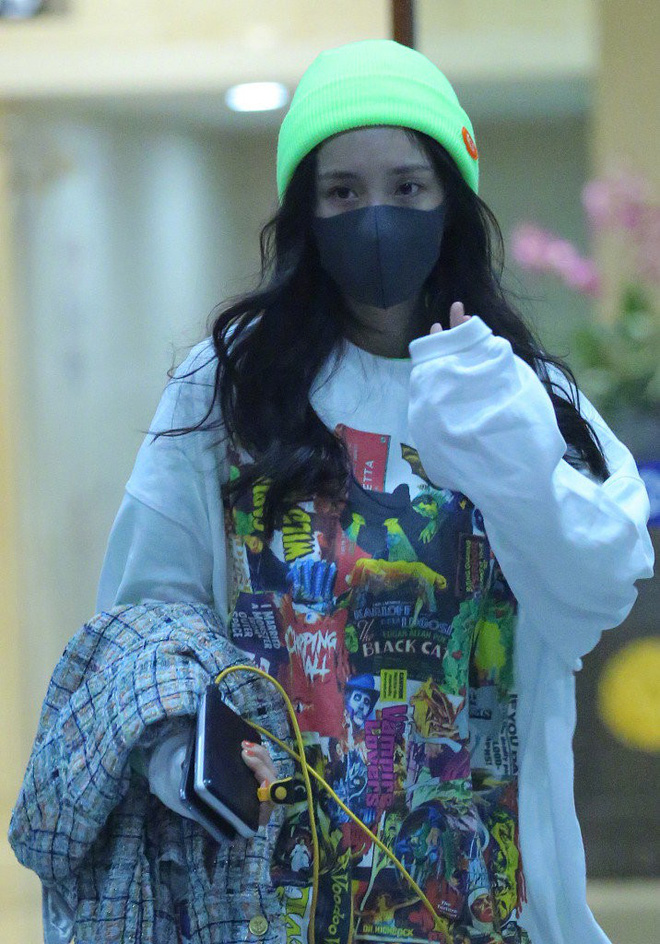 Bên cạnh những bộ trang phục in hình hoạt họa dễ thương, Dương Mịch còn chăm sử dụng những món phụ kiện màu neon vừa nổi bật lại trẻ trung. Chỉ cần nhấn nhá thêm cho set đồ với một chiếc mũ màu neon, một chiếc túi nhỏ xinh; hoặc mặc thêm một chiếc áo dài tay màu neon bên trong áo phông là cô đã có ngay set đồ đơn giản, năng động mà còn trông trẻ trung ra vài tuổi.