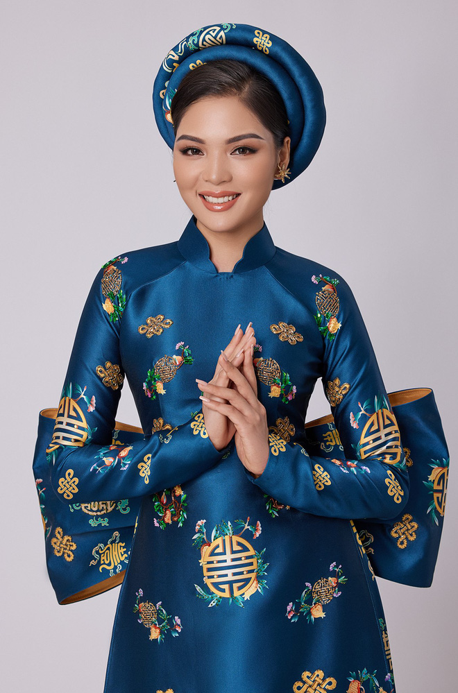 Kỹ thuật thêu đính hiệu ứng 3D trên phom dáng truyền thống giúp cô nổi bật, tôn đường cong. Thân áo khắc họa những hình ảnh đậm nét văn hóa dân gian như trâu vàng, chim hạc, tranh Đông Hồ, tranh Kim Hoàng...